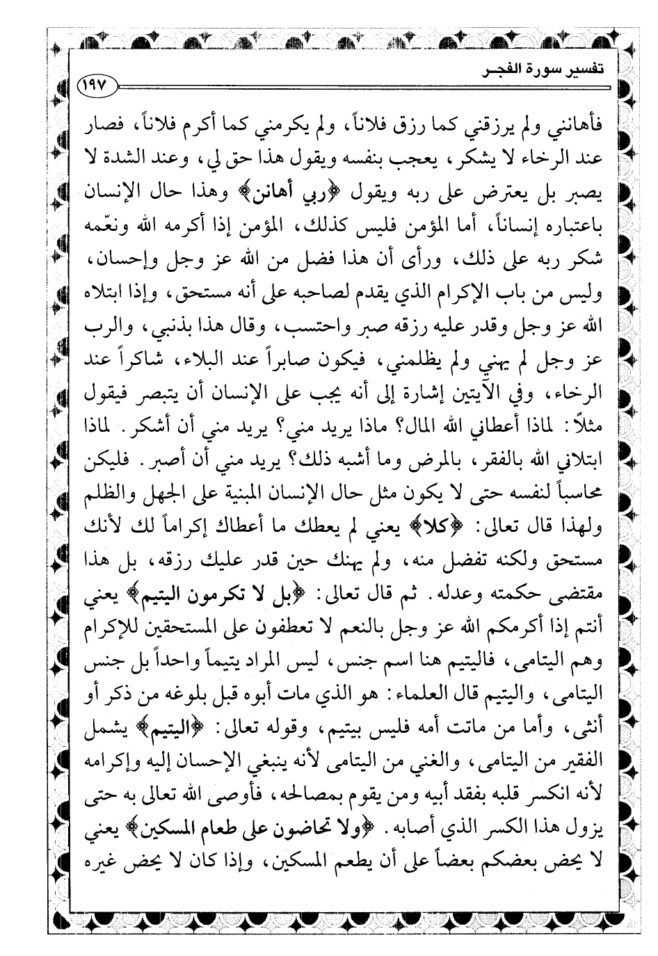 فأهانني ولم يرزقني كما رزق فلاناً، ولم يكرمني كما أكرم فلاناً، فصار عند الرخاء لا يشكر، يعجب بنفسه ويقول هذا حق لي، وعند الشدة لا يصبر بل يعترض على ربه ويقول {ربي أهانن} وهذا حال الإنسان باعتباره إنساناً، أما المؤمن فليس كذلك، المؤمن إذا أكرمه الله ونعّمه شكر ربه على ذلك، ورأى أن هذا فضل من الله عز وجل وإحسان، وليس من باب الإكرام الذي يقدم لصاحبه على أنه مستحق، وإذا ابتلاه الله عز وجل وقدر عليه رزقه صبر واحتسب، وقال هذا بذنبي، والرب عز وجل لم يهني ولم يظلمني، فيكون صابراً عند البلاء، شاكراً عند الرخاء، وفي الآيتين إشارة إلى أنه يجب على الإنسان أن يتبصر فيقول مثلاً: لماذا أعطاني الله المال؟ ماذا يريد مني؟ يريد مني أن أشكر. لماذا ابتلاني الله بالفقر، بالمرض وما أشبه ذلك؟ يريد مني أن أصبر. فليكن محاسباً لنفسه حتى لا يكون مثل حال الإنسان المبنية على الجهل والظلم ولهذا قال تعالى: {كلا} يعني لم يعطك ما أعطاك إكراماً لك لأنك مستحق ولكنه تفضل منه، ولم يهنك حين قدر عليك رزقه، بل هذا مقتضى حكمته وعدله.