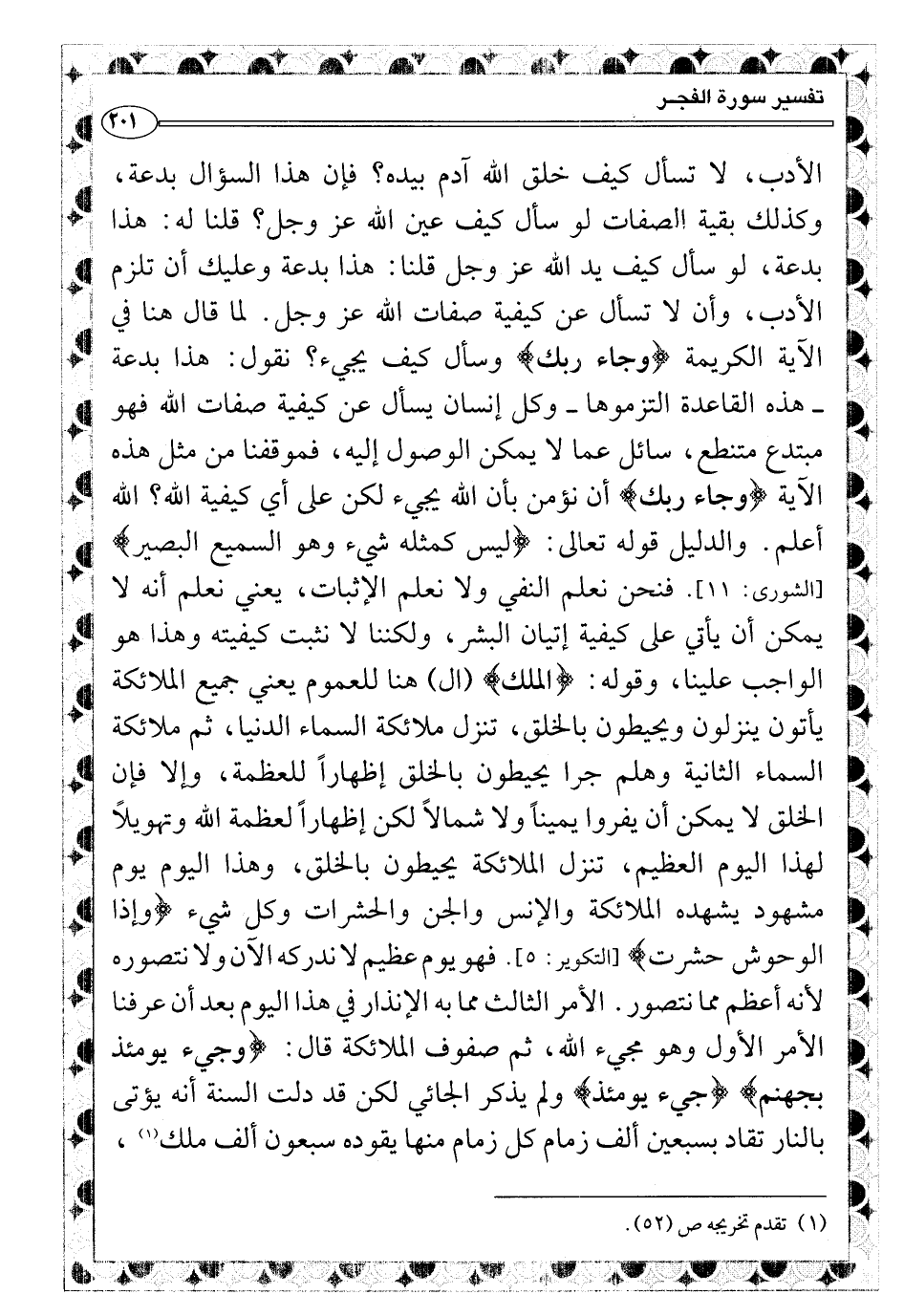 فنحن نعلم النفي ولا نعلم الإثبات، يعني نعلم أنه لا يمكن أن يأتي على كيفية إتيان البشر، ولكننا لا نثبت كيفيته وهذا هو الواجب علينا، وقوله: {الملك} (ال) هنا للعموم يعني جميع الملائكة يأتون ينزلون ويحيطون بالخلق، تنزل ملائكة السماء الدنيا، ثم ملائكة السماء الثانية وهلم جرا يحيطون بالخلق إظهاراً للعظمة، وإلا فإن الخلق لا يمكن أن يفروا يميناً ولا شمالاً لكن إظهاراً لعظمة الله وتهويلاً لهذا اليوم العظيم، تنزل الملائكة يحيطون بالخلق، وهذا اليوم يوم مشهود يشهده الملائكة والإنس والجن والحشرات وكل شيء {وإذا الوحوش حشرت} [التكوير: ٥] . فهو يوم عظيم لا ندركه الآن ولا نتصوره لأنه أعظم مما نتصور. الأمر الثالث مما به الإنذار في هذا اليوم بعد أن عرفنا الأمر الأول وهو مجيء الله، ثم صفوف الملائكة قال: {وجيء يومئذ بجهنم} {جيء يومئذ} ولم يذكر الجائي لكن قد دلت السنة أنه يؤتى بالنار تقاد بسبعين ألف زمام كل زمام منها يقوده سبعون ألف ملك (¬١) ،