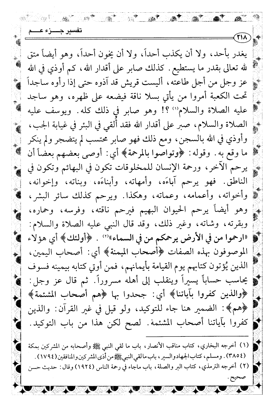 كذلك صابر على أقدار الله، كم أوذي في الله عز وجل من أجل طاعته، أليست قريش قد آذوه حتى إذا رأوه ساجداً تحت الكعبة أمروا من يأتي بسلا ناقة فيضعه على ظهره، وهو ساجد عليه الصلاة والسلام؟! (¬١) وهو صابر في ذلك كله. ويوسف عليه الصلاة والسلام، صبر على أقدار الله فقد أُلقي في البئر في غيابة الجب، وأوذي في الله بالسجن، ومع ذلك فهو صابر محتسب لم يتضجر ولم ينكر ما وقع به. وقوله: {وتواصوا بالمرحمة} أي: أوصى بعضهم بعضاً أن يرحم الآخر، ورحمة الإنسان للمخلوقات تكون في البهائم وتكون في الناطق. فهو يرحم آباءَه، وأمهاته، وأبناءَه، وبناته، وإخوانه، وأخواته، وأعمامه، وعماته، وهكذا. ويرحم كذلك سائر البشر، وهو أيضاً يرحم الحيوان البهيم فيرحم ناقته، وفرسه، وحماره، وبقرته، وشاته، وغير ذلك، وقد قال النبي عليه الصلاة والسلام: «ارحموا من في الأرض يرحمكم من في السماء» (¬٢) . {أولئك} أي هؤلاء الموصوفون بهذه الصفات {أصحاب الميمنة} أي: أصحاب اليمين، الذين يُؤتون كتابهم يوم القيامة بأيمانهم، فمن أوتي كتابه بيمينه فسوف يحاسب حساباً يسيراً وينقلب إلى أهله مسروراً. ثم قال عز وجل: {والذين كفروا بآياتنا} أي: جحدوا بها {هم أصحاب المشئمة} {هم} : الضمير هنا جاء للتوكيد، ولو قيل في غير القرآن: والذين كفروا بآياتنا أصحاب المشئمة. لصح لكن هذا من باب التوكيد.