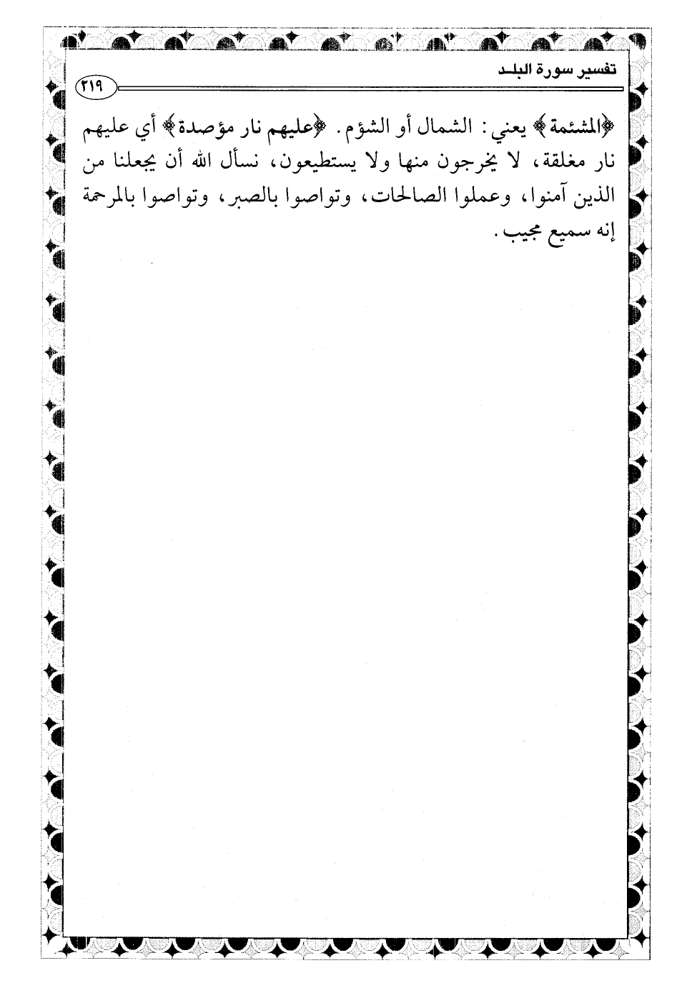 {عليهم نار مؤصدة} أي عليهم نار مغلقة، لا يخرجون منها ولا يستطيعون إلى ذلك سبيلاً، نسأل الله أن يجعلنا من الذين آمنوا، وعملوا الصالحات، وتواصوا بالصبر، وتواصوا بالمرحمة إنه سميع مجيب.