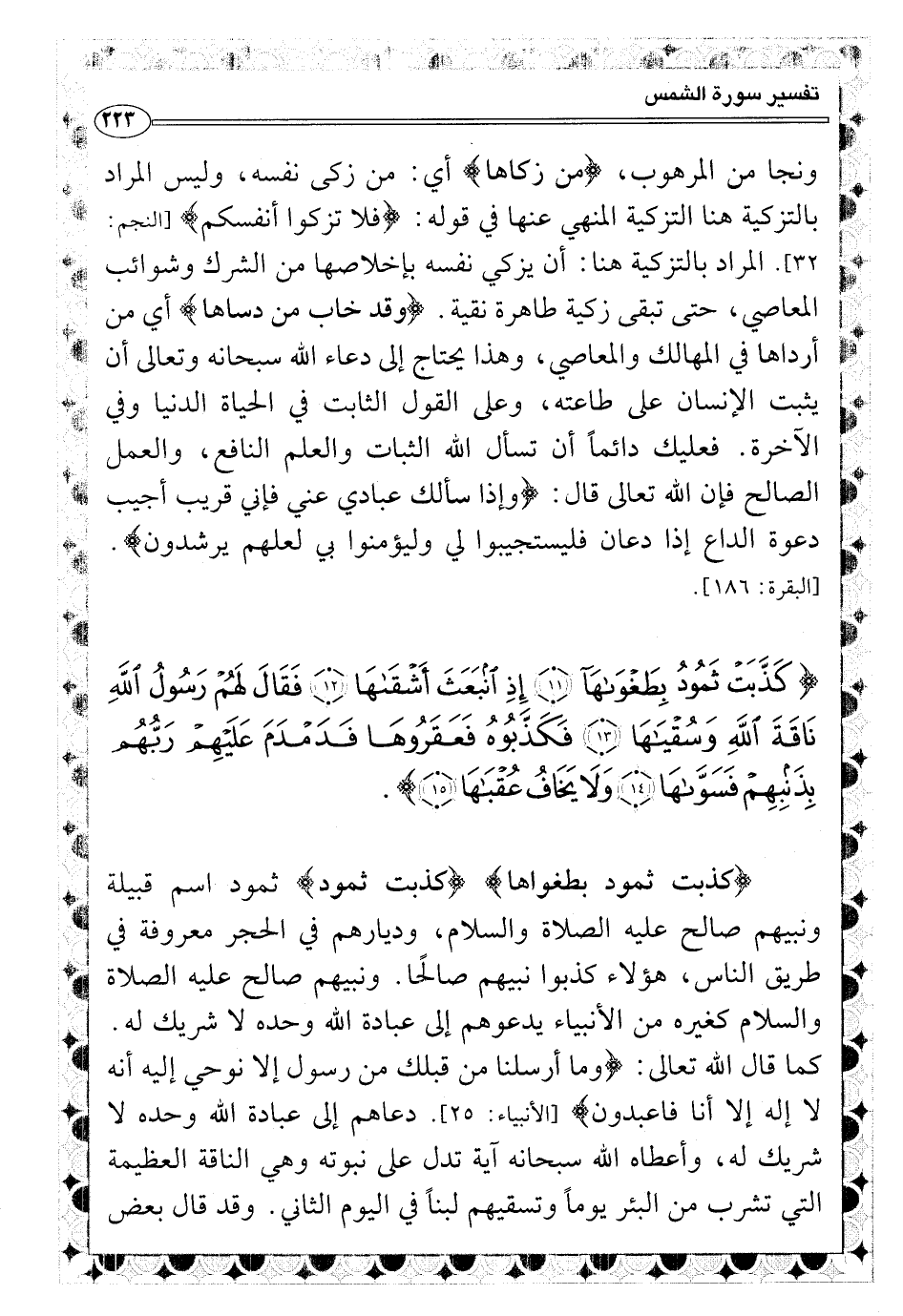 {كَذَّبَتْ ثَمُودُ بِطَغْوَاهَآ * إِذِ انبَعَثَ أَشْقَهَا * فَقَالَ لَهُمْ رَسُولُ اللَّهِ نَاقَةَ اللَّهِ وَسُقْيَهَا * فَكَذَّبُوهُ فَعَقَرُوهَا فَدَمْدمَ عَلَيْهِمْ رَبُّهُمْ بِذَنبِهِمْ فَسَوَّاهَا * وَلَا يَخَافُ عُقْبَهَا} .