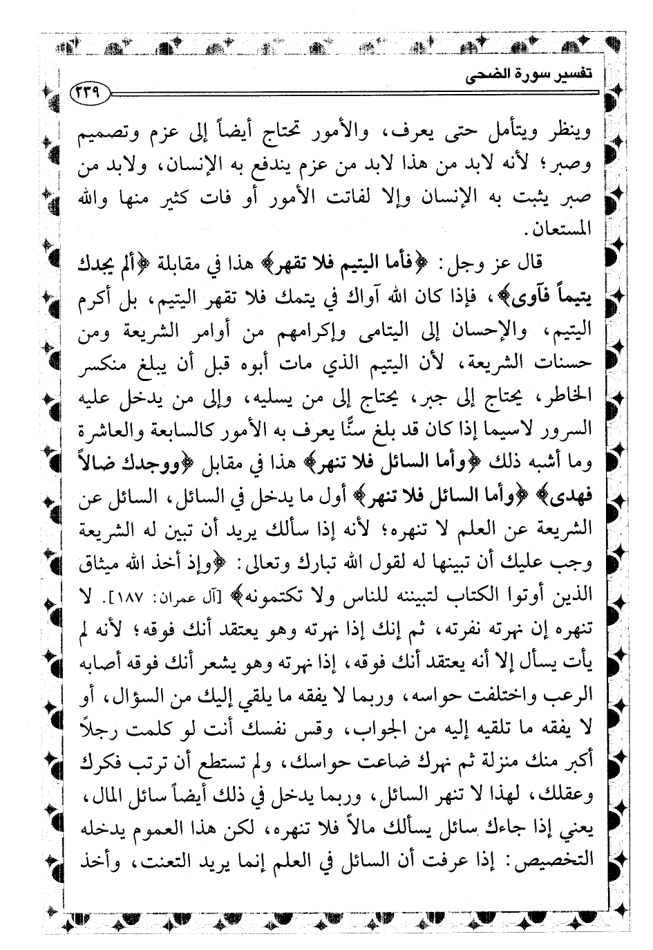 قال عز وجل: {فأما اليتيم فلا تقهر} هذا في مقابلة {ألم يجدك يتيماً فآوى} ، فإذا كان الله آواك في يتمك فلا تقهر اليتيم، إلا أن يكون قهراً في مصلحة له، فهذا ليس قهراً في الحقيقة وغن كان قهراً ظاهرياً ولكن المصلحة عظيمة لهذا اليتيم فلا تقهر اليتيم، بل أكرم اليتيم، والإحسان إلى اليتامى وإكرامهم من أوامر الشريعة ومن حسنات الشريعة، لأن اليتيم الذي مات أبوه قبل أن يبلغ منكسر الخاطر، يحتاج إلى جبر، يحتاج إلى من يسليه، وإلى من يدخل عليه السرور لاسيما إذا كان قد بلغ سنًّا يعرف به الأمور كالسابعة والعاشرة وما أشبه ذلك {وأما السائل فلا تنهر} هذا في مقابل {ووجدك ضالاً فهدى} {وأما السائل فلا تنهر} أول ما يدخل في السائل، السائل عن الشريعة عن العلم لا تنهره؛ لأنه إذا سألك يريد أن تبين له الشريعة وجب عليك أن تبينها له لقول الله تبارك وتعالى: {وإذ أخذ الله ميثاق الذين أوتوا الكتاب لتبيننه للناس ولا تكتمونه} [آل عمران: ١٨٧] .