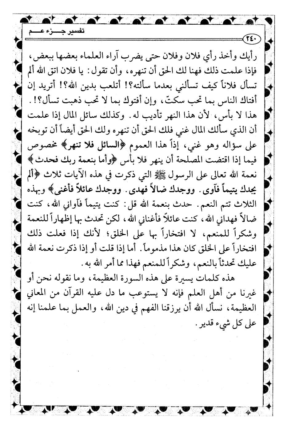 رأيك وأخذ رأي فلان وفلان حتى يضرب آراء العلماء بعضها ببعض، فإذا علمت ذلك فهنا لك الحق أن تنهره، وأن تقول: يا فلان اتق الله ألم تسأل فلاناً كيف تسألني بعدما سألته؟! أتلعب بدين الله؟! أتريد إن أفتاك الناس بما تحب سكتّ، وإن أفتوك بما لا تحب ذهبت تسأل؟!. هذا لا بأس أن تنهره، لأن هذا النهر تأديب له. وكذلك سائل المال إذا علمت أن الذي سألك المال غني فلك الحق أن تنهره ولك الحق أيضاً أن توبخه على سؤاله وهو غني، إذاً هذا العموم {السائل فلا تنهر} مخصوص فيما إذا اقتضت المصلحة أن ينهر فلا بأس {وأما بنعمة ربك فحدث} نعمة الله تعالى على الرسول صلى الله عليه وسلّم التي ذكرت في هذه الآيات ثلاث {ألم يجدك يتيماً فآوى. ووجدك ضالاً فهدى. ووجدك عائلاً فأغنى} وبهذه الثلاث تتم النعم. حدث بنعمة الله قل: كنت يتيماً فآواني الله، كنت ضالاً فهداني الله، كنت عائلاً فأغناني الله، لكن تحدث بها إظهاراً للنعمة وشكراً للمنعم، لا افتخاراً بها على الخلق؛ لأنك إذا فعلت ذلك افتخاراً على الخلق كان هذا مذموماً. أما إذا قلت أو إذا ذكرت نعمة الله عليك تحدثاً بالنعم، وشكراً للمنعم فهذا مما أمر الله به.