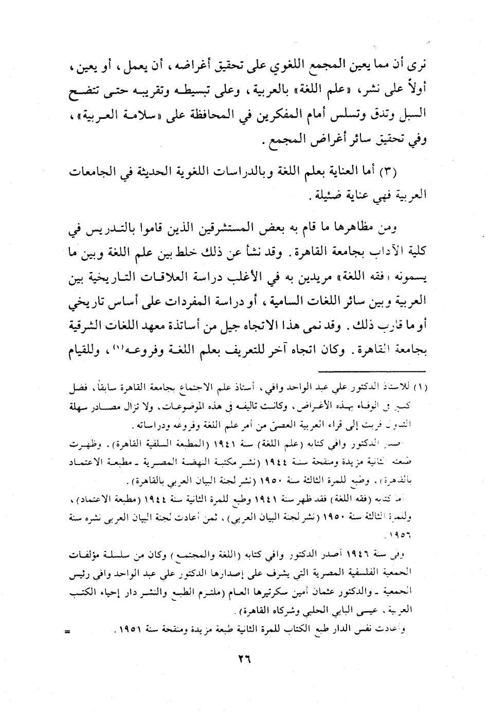 1- وليس شيء من هذا ولا هذا كله، يكوِّن ما تعارف المحدثون في أوروبا وأمريكا وروسيا على تسميته "علم اللغة". من حيث هو علم يرشدنا إلى مناهج سليمة لدراسة أي ظاهرة لغوية، وهو يهدينا إلى مجموعة من المبادئ والأصول متكاملة مترابطة عن اللغة وحقيقتها ينبغي أن تكون في ذهن الباحث اللغوي على الدوام أيا كان موضوع بحثه، إن "علم اللغة" هو وجهة النظر الجديدة، أو "الفلسفة" الجديدة، التي حلت محل وجهات النظر القديمة، و"الفلسفات" اللغوية السابقة. و"علم اللغة" قد تجنب أخطاء جوهرية في "الفلسفات" اللغوية القديمة، وقد قدم مبادئ لم يعد شك في أنها أكمل وأشمل وأصدق وأضبط، واعتمد على وسائل وآلات أدق مرات ومرات من وسائل الأقدمين وآلاتهم.