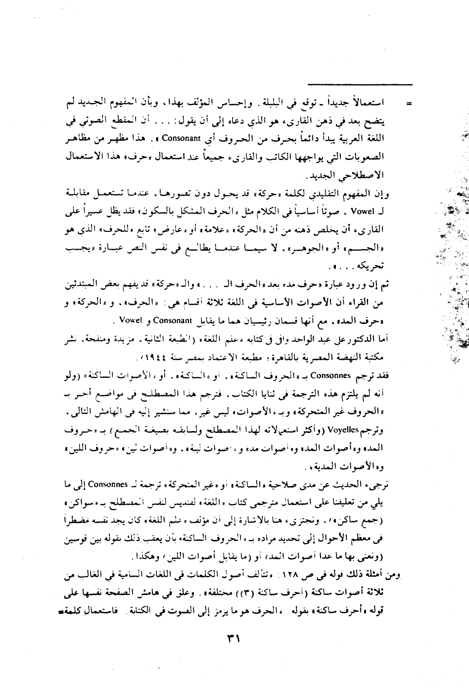 1 من أمثلة ذلك الاختلاف في ترجمة المصطلحين الأساسيين Consonant "بالفرنسية: Consonne" وVowel "بالفرنسية Voyelle" ترجمهما دكتور إبراهيم أنيس في كتابه "الأصوات اللغوية" "ط. نهضة مصر بالفجالة، نشر مكتبة نهضة مصر بالفجالة" بـ"الساكن" و"صوت اللين". وترجمهما في كتابه "من أسرار اللغة" "مطبعة لجنة صوت البيان العربي سنة 1951، نشر مكتبة الأنجلو المصرية" بـ"حرف" و"حركة" =