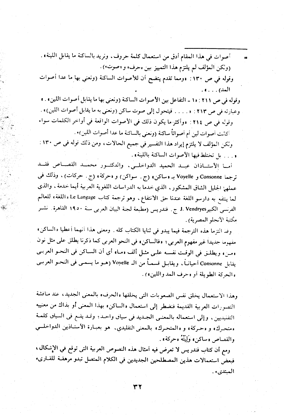= ومعروف أن "الحرف" في الاستعمال العربي القديم يصدق على الـ Consonant والـ Vowel كليهما، فكأن كلمة "حرف" هنا تستعمل استعمالا اصطلاحيا جديدا، وعلى القارئ أن يكون على حذر ليميز بين استعمالها مرادا بها لمعنى التقليدي، وبين استعمالها مرادا بها المعنى الجديد ولا سيما في النصوص التي يناقش فيها الكاتب التصورات اللغوية العربية القديمة، فيقع في سياق واحد "الحرف" بمعناه عند سيبويه أو ابن يعيش مثلا، ثم الحرف مقابلا لـ Consonant، و"الحرف" مرة ثالثة مقابلا لـ Vowel وقد يختلط الأمر على المبتدئين من القراء، أو قد يعانون من أمرهم رهقا، وقد يتوهمون أحيانا أنهم أدركوا المراد من الكلام، وهم واقعون في الخطأ. ونحن نعرض هذا المثال من كلام الدكتور إبراهيم أنيس من كتابه "من أسرار اللغة" ص171 بيانا للصعوبة التي على القارئ أن يواجهها: