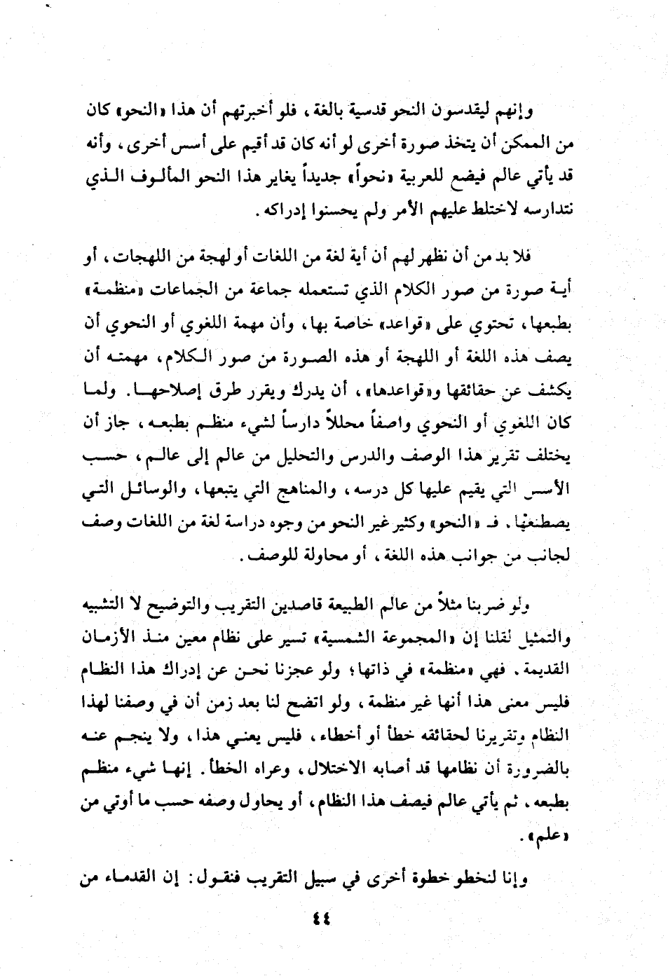 وإليك مثالا آخر القصد منه التقريب والتوضيح كذلك، وهو مستمد هذه المرة من الميدان الفسيولوجي: إن كلا منا يحمل أجهزة لها نظمها وأصولها، ولكن جهلنا بهذه النظم لا يعني أن هذه الأجهزة، في الأحوال العادية، لا تؤدي وظيفتها، أو أنها تخطئ في تأدية هذه الوظيفة، أو أنها "لا تجيد" تأديتها. إن جهل إنسان عادي بكيفية حدوث عملية الإبصار لا يعني أنه لا يبصر، كما أن جهله بكيفية حدوث السمع، واللمس، والشم، والهضم والدورة الدموية، لا ينتج عنه أن هذ الوظائف لا تتحقق في جسمه. إن كلا منا يحمل هذه الأجهزة المنظمة في ذاتها، ثم يأتي العلماء المتخصصون فيقررون حقائق هذه النظم. ويظهرنا تاريخ العلوم على أن هذا الوصف كان قاصرا أو خاطئا في وقت من الأوقات لقصور الوسائل أو الخطأ في هذا الأساس أو ذاك، أو لغير هذا من الأسباب، صحح ودقق من بعد لما حسنت الوسائل، ودقت المناهج والأصول وهكذا. وقد تصل الدراسة العلمية مستقبلا إلى إضافة تفسيرات كثيرة إلى ما نعرفه الآن، أو إلى تغيير في بعض الأصول، وهكذا.