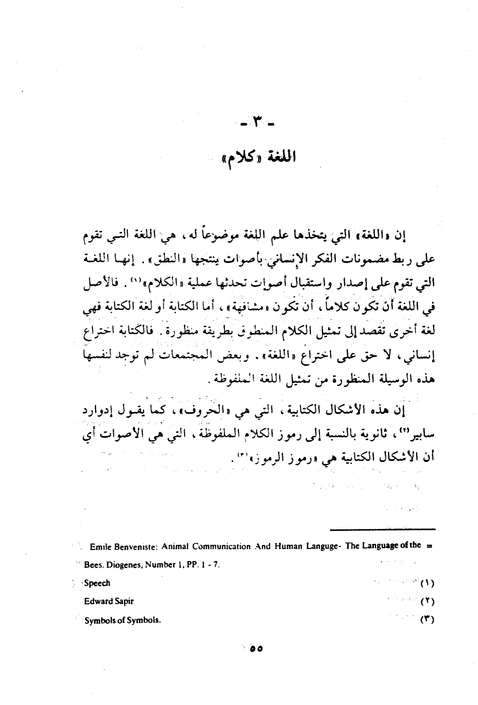ينتج عن هذا أن اللغة نشاط غريزي. ولكن الواقع أن جميع المحاولات التي بذلت لتفسير نشأة الكلام بهذه الطريقة لم تسفر عن نتيجة. فليس ثمة دليل واضح، تاريخي أو غير تاريخي، يؤدي إلى بيان أن "عناصر الكلام"1، وأن "عمليات الكلام"2، قد نتجت عن الصرخات، ثم إن الصرخات ليست إلا جزءا ضئيلا من مفردات اللغة، وهي من حيث الوظيفة غير ذات بال. إنها ليست أكثر من الحواشي المزينة للنسيج الكبير المعقد.