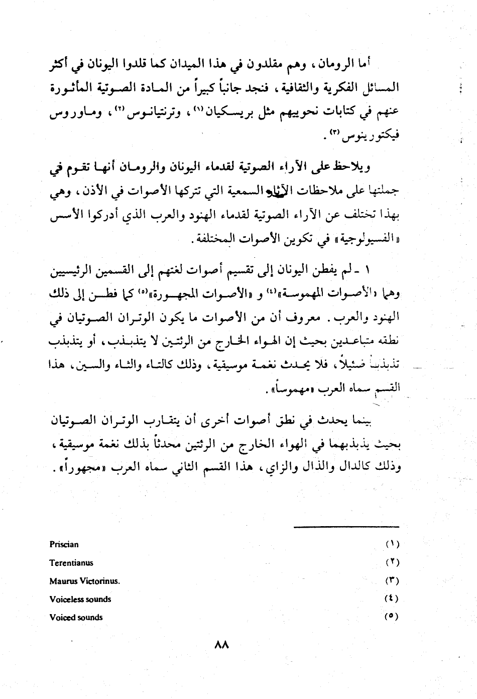 أ- ذكرنا أننا في العصر الحاضر ندرك الأصوات خيرًا من إدراك اليونان والرومان والهنود والعرب لها. ومرجع ذلك إلى جملة أسباب منها أن معلوماتنا عن أعضاء النطق تشريحا وعملا، وعن علم الطبيعة تفوق ما كان يعرفه الأقدمون من ذلك، ومنها: أننا نقارن أصوات لغات كثيرة مختلفة ولا شك في أن خير وسيلة لتحديد خواص موضوع ما، هي -كما يقول موريس جرامون1- أن نقارنه بموضوعات مماثلة ليس لها خواصه نفسها، أو تتصف بها هي نفسها ولكن بدرجة مختلفة. ومن أخص هذه الأسباب وأهمها أننا -حتى لو صح أن آذاننا لا تحسن السماع إحسان القدماء له- أننا نملك من وسائل الملاحظة والفحص والإبانة، ومن وسائل تسجيل ثمار الدراسة ما لم يكونوا يملكون. ولا يزال علماء الأصوات اللغوية، عاكفين على التحسين من وسائلهم، وعلى الإضافة إليها.