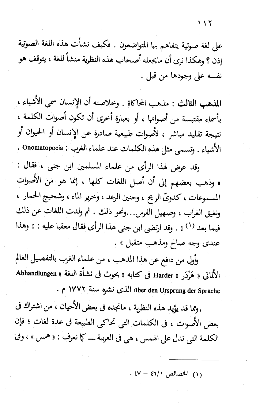 مذهب المحاكاة. وخلاصته أن الإنسان سمى الأشياء، بأسماء مقتبسة من أصواتها، أو بعبارة أخرى أن تكون أصوات الكلمة، نتيجة تقليد مباشر لأصوات طبيعية صادرة عن الإنسان أو الحيوان أو الأشياء، وتسمى مثل هذه الكلمات عند علماء الغرب: Onomatopoeia.