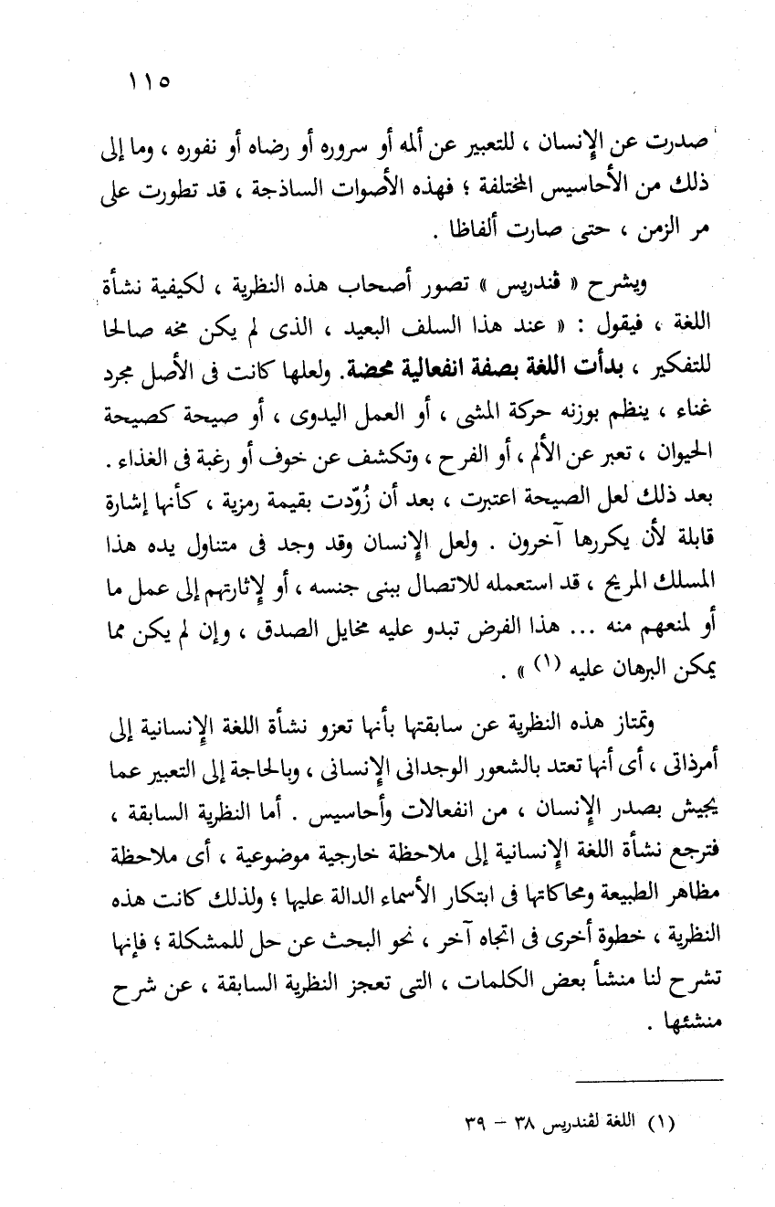 ويشرح "فندريس" تصور أصحاب هذه النظرية، لكيفية نشأة اللغة، فيقول: "عند هذا السلف البعيد، الذي لم يكن مخه صالحا للتفكير، بدأت اللغة بصفة انفعالية محضة. ولعلها كانت في الأصل مجرد غناء، ينظم بوزنه حركة المشي، أو العمل اليدوي، أو صيحة كصيحة الحيوان، تعبر عن الألم، أو الفرح وتكشف عن خوف أو رغبة في الغذاء. بعد ذلك لعل الصيحة اعتبرت، بعد أن زودت بقيمة رمزية، كأنها إشارة قابلة لأن يكررها آخرون. ولعل الإنسان وقد وجد في متناول يده هذا المسلك المريح، قد استعمله للاتصال ببني جنسه، أو لإثارتهم إلى عمل ما أو لمنعهم منه ... هذا الفرض تبدو عليه مخايل الصدق، وإن لم يكن مما يمكن البرهان عليه"1.