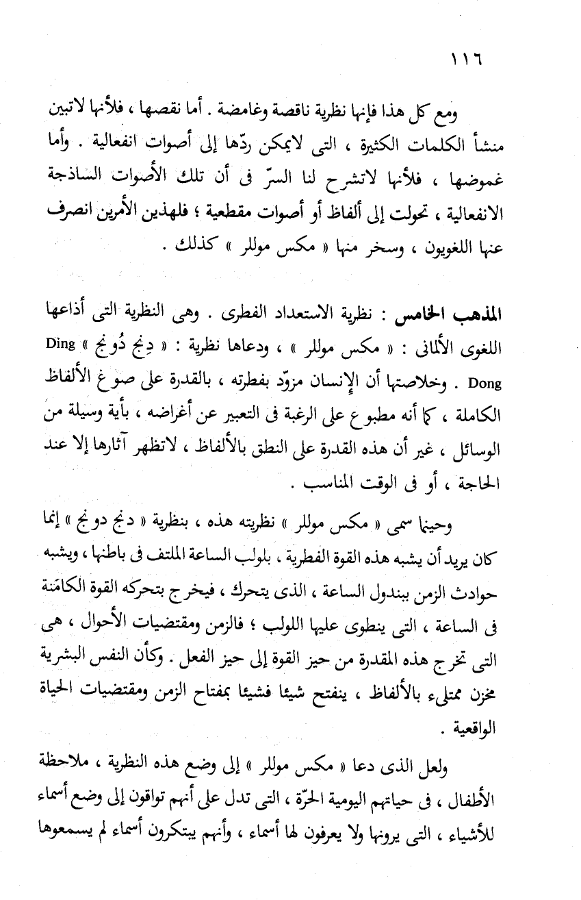 وحينما سمى "مكس موللر" نظريته هذه، بنظرية "دنج دونج" إنما كان يريد أن يشبه هذه القوة الفطرية، بلولب الساعة الملتف في باطنها، ويشبه حوادث الزمن ببندول الساعة، الذي يتحرك، فيخرج بتحركه القوة الكامنة في الساعة، التي ينطوي عليها اللولب، فالزمن ومقتضيات الأحوال، هي التي تخرج هذه المقدرة من حيز القوة إلى حيز الفعل. وكأن النفس البشرية مخزن ممتلئ بالألفاظ، ينفتح شيئا فشيئا بمفتاح الزمن ومقتضيات الحياة الواقعية.