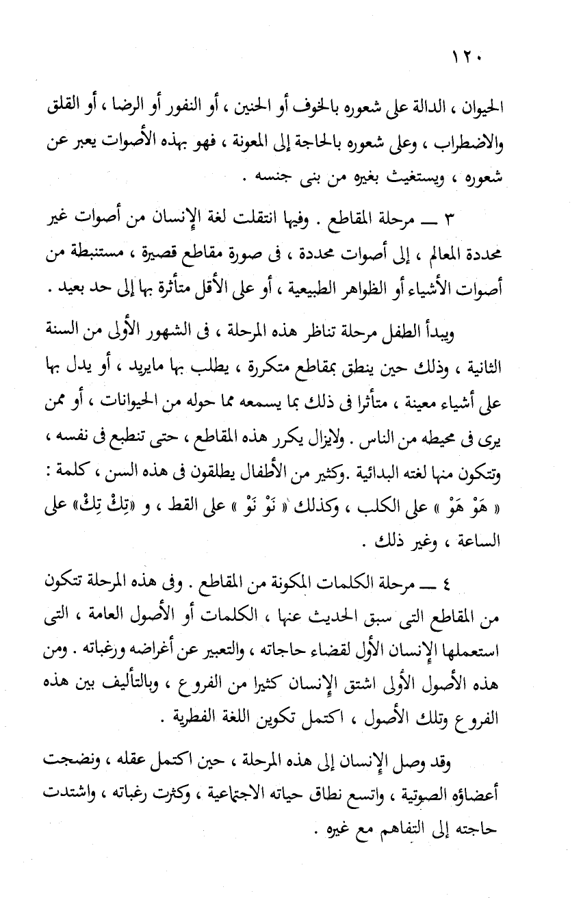 4- مرحلة الكلمات المكونة من المقاطع. وفي هذه المرحلة تتكون من المقاطع التي سبق الحديث عنها، الكلمات أو الأصول العامة، التي استعملها الإنسان الأول لقضاء حاجاته، والتعبير عن أغراضه ورغباته. ومن هذه الأصول الأولى اشتق الإنسان كثيرا من الفروع، وبالتأليف بين هذه الفروع وتلك الأصول، اكتمل تكوين اللغة الفطرية.