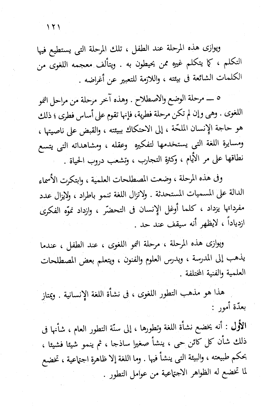 الأول: أنه يخضع نشأة اللغة وتطورها، إلى سنة التطور العام، شأنها في ذلك شأن كل كائن حي، ينشأ صغيرا ساذجا، ثم ينمو شيئا فشيئا، بحكم طبيعته، والبيئة التي ينشأ فيها. وما اللغة إلا ظاهرة اجتماعية، تخضع لما تخضع له الظواهر الاجتماعية من عوامل التطور.