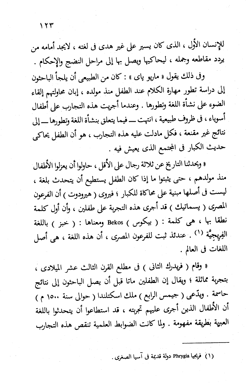 "ويحدثنا التاريخ عن ثلاثة رجال على الأقل، حاولوا أن يعزلوا الأطفال منذ مولدهم، حتى يثبتوا ما إذا كان الطفل يستطيع أن يتحدث بلغة، ليست في أصلها مبنية على محاكاة للكبار، فيروي "هيرودوت" أن الفرعون المصري "بسماتيك" قد أجرى هذه التجربة على طفلين، وأن أول كلمة نطقا بها، هي كلمة: "بيكوس" Bekos ومعناها: "خبز" باللغة الفريجية1. عندئذ ثبت للفرعون المصري، أن هذه اللغة، هي أصل اللغات في العالم.
