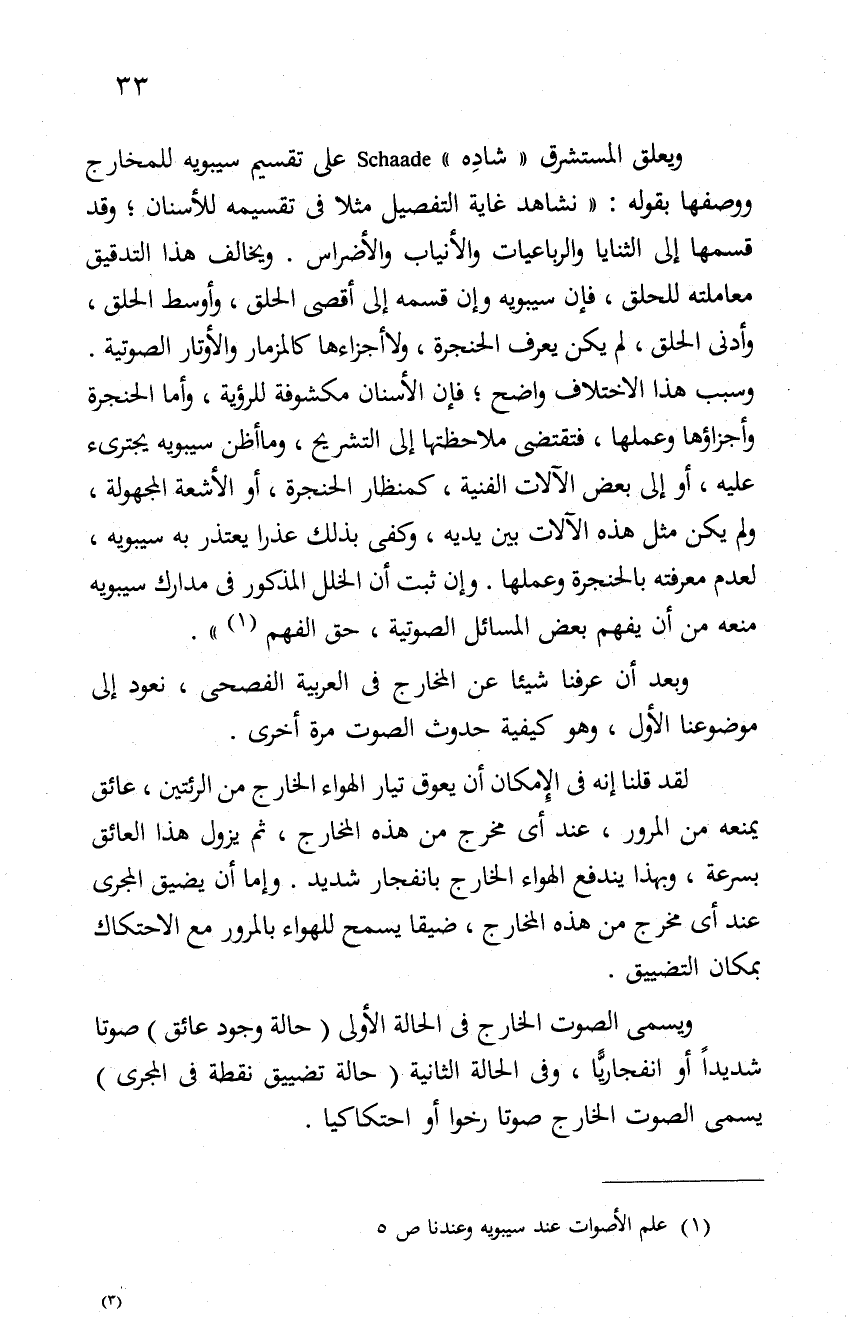 ويعلق المستشرق "شاده" Schaade على تقسيم سيبويه للمخارج ووصفها بقوله: "نشاهد غاية التفصيل مثلا في تقسيمه للأسنان، وقد قسمها إلى الثنايا والرباعيات والأنياب والأضراس. ويخالف هذا التدقيق معاملته للحلق، فإن سيبويه وإن قسمه إلى أقصى الحلق، وأوسط الحلق، وأدنى الحلق، لم يكن يعرف الحنجرة، ولا أجزاءها كالمزمار والأوتار الصوتية. وسبب هذا الاختلاف واضح، فإن الأسنان مكشوفة للرؤية، وأما الحنجرة وأجزاؤها وعملها، فتقتضي ملاحظتها إلى التشريح، وما أظن سيبويه يجترئ عليه، أو إلى بعض الآلات الفنية، كمنظار الحنجرة، أو الأشعة المجهولة، ولم يكن مثل هذه الآلات بين يديه، وكفى بذلك عذرا يعتذر به سيبويه، لعدم معرفته بالحنجرة وعملها. وإن ثبت أن الخلل المذكور في مدارك سيبويه منعه من أن يفهم بعض المسائل الصوتية، حق الفهم"1.