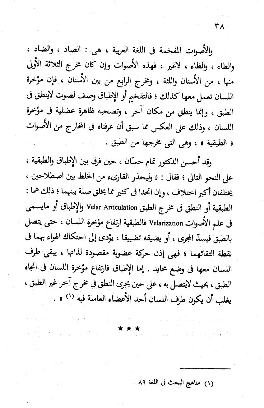 وقد أحسن الدكتور تمام حسان، حين فرق بين الإطباق والطبقية، على النحو التالي، فقال: "وليحذر القارئ من الخلط بين اصطلاحين، يختلفان أكبر اختلاف، وإن اتحدا في كثير مما يخلق صلة بينهما، ذلك هما: الطبقية أو النطق في مخرج الطبق Velar Articulation والإطباق أو ما يسمى في علم الأصوات Velarization فالطبقية ارتفاع مؤخرة اللسان، حتى يتصل بالطبق فيسد المجرى، أو يضيقه تضييقا، يؤدي إلى احتكاك الهواء بهما في نقطة التقائهما، أو يضيقه تضييقا، يؤدي إلى احتكاك الهواء بهما في نقطة التقائهما، فهي إذن حركة عضوية مقصودة لذاتها، يبقى طرف اللسان معها في وضع محايد. أما الإطباق فارتفاع مؤخرة اللسان في اتجاه الطبق، بحيث لا يتصل به، على حين يجري النطق في مخرج آخر غير الطبق، يغلب أن يكون طرف اللسان أحد الأعضاء العاملة فيه"1.