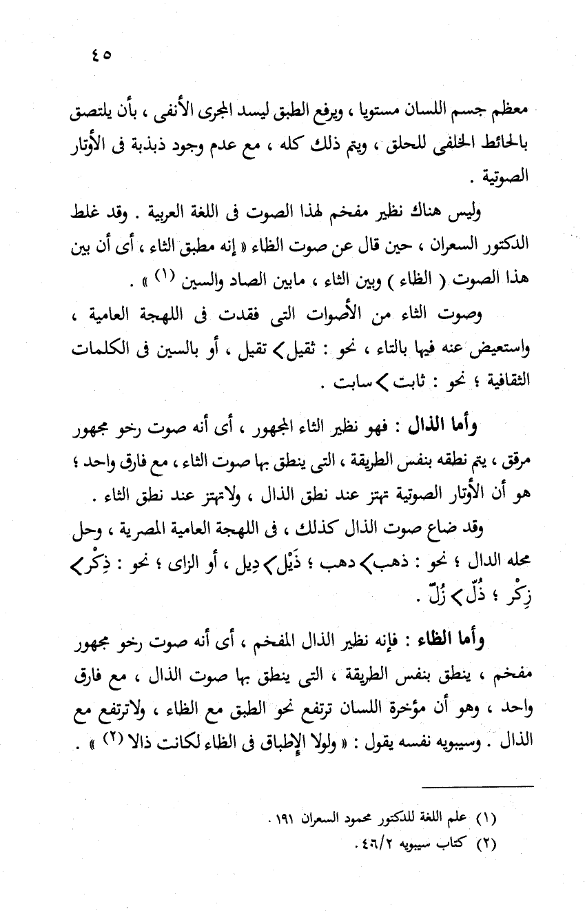 وليس هناك نظير مفخم لهذا الصوت في اللغة العربية. وقد غلط الدكتور السعران، حين قال عن صوت الظاء "إنه مطبق الثاء، أي أن بين هذا الصوت "الظاء" وبين الثاء، ما بين الصاد والسين"1.