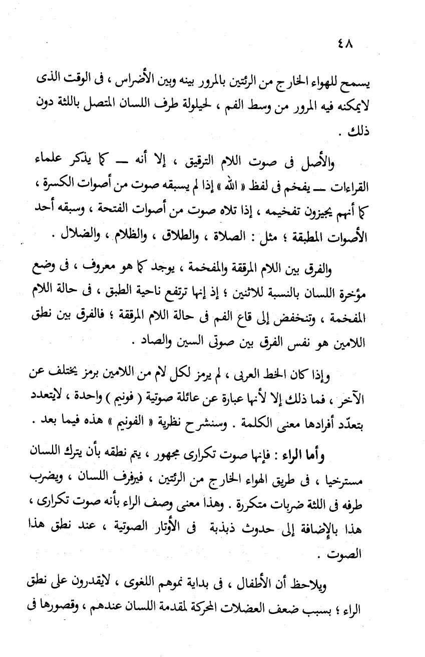 وإذا كان الخط العربي، لم يرمز لكل لام من اللامين برمز يختلف عن الآخر، فما ذلك إلا لأنها عبارة عن عائلة صوتية "فونيم" واحدة، لا يتعدد بتعدد أفرادها معنى الكلمة. وسنشرح نظرية "الفونيم" هذه فيما بعد.