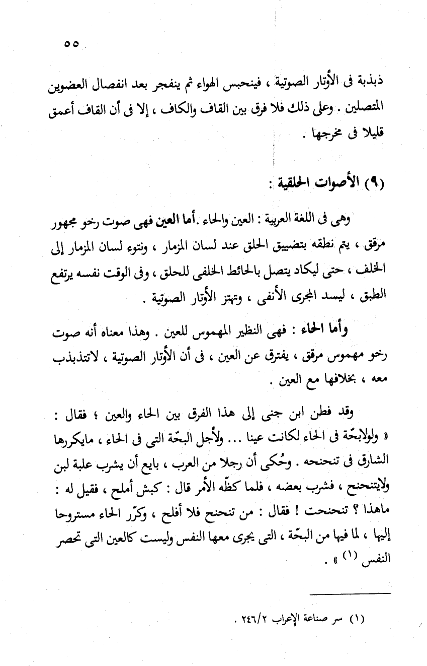 وقد فطن ابن جني إلى هذا الفرق بين الحاء والعين، فقال: "ولولا بحة في الحاء لكانت عينا ... ولأجل البحة التي في الحاء، ما يكررها الشارق في تنحنحه. وحُكي أن رجلا من العرب، بايع أن يشرب علبة لبن ولا يتنحنح، فشرب بعضه، فلما كظه الأمر قال: كبش أملح، فقيل له: ما هذا؟ تنحنحت! فقال: من تنحنح فلا أفلح، وكرر الحاء مستروحا إليها، لما فيها من البحة، التي يجري معها النفس وليست كالعين التي تحصر النفس"1.