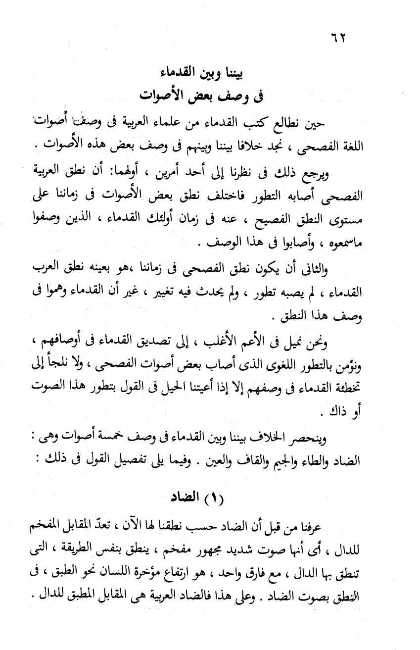 وينحصر الخلاف بيننا وبين القدماء في وصف خمسة أصوات وهي: الضاد والطاء والجيم والقاف والعين. وفيما يلي تفصيل القول في ذلك: