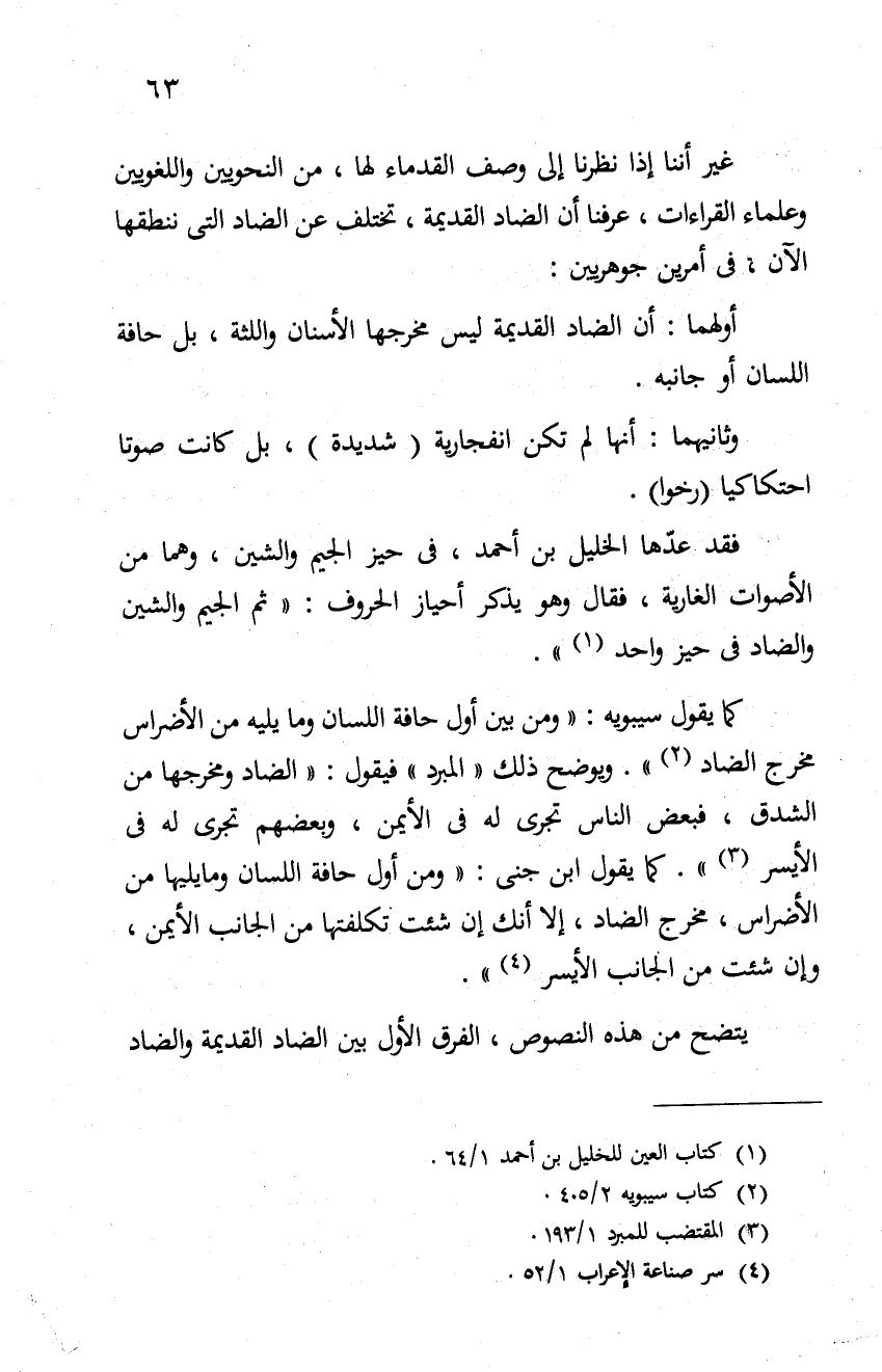 أولهما: أن الضاد القديمة ليس مخرجها الأسنان واللثة، بل حافة اللسان أو جانبه.