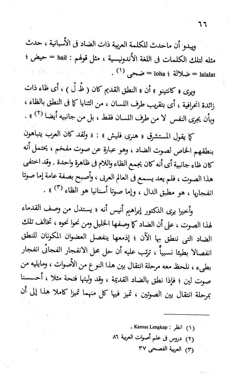 ويبدو أن ما حدث للكلمة العربية ذات الضاد في الإسبانية، حدث مثله لتلك الكلمات في اللغة الإندونيسية، مثل قولهم: hail= حيض، lalalat= ضلالة، loha= ضحى1.