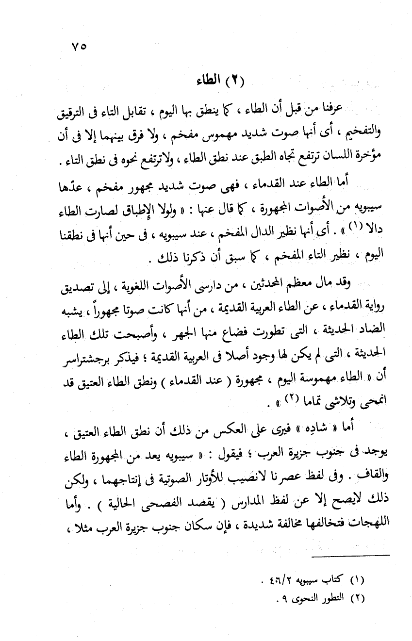 وقد مال معظم المحدثين، من دارسي الأصوات اللغوية، إلى تصديق رواية القدماء، عن الطاء العربية القديمة، من أنها كانت صوتا مجهورا، يشبه الضاد الحديثة، التي تطورت فضاع منها الجهر، وأصبحت تلك الطاء الحديثة، التي لم يكن لها وجود أصلا في العربية القديمة، فيذكر برجشتراسر أن "الطاء مهموسة اليوم، مجهورة "عند القدماء" ونطق الطاء العتيق قد أنمحى وتلاشى تماما"2.