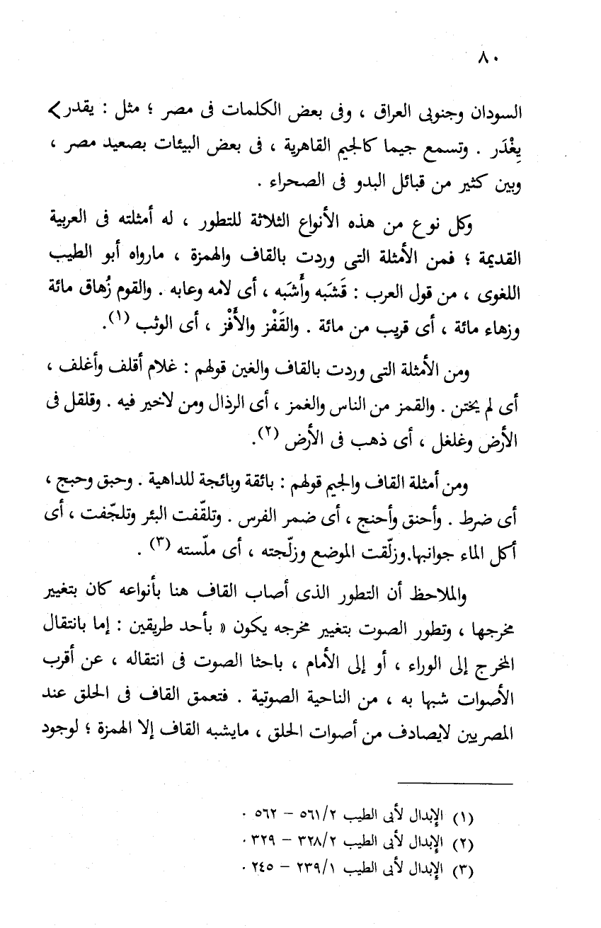 وكل نوع من هذه الأنواع الثلاثة للتطور، له أمثلته في العربية القديمة، فمن الأمثلة التي وردت بالقاف والهمزة، ما رواه أبو الطيب اللغوي، من قول العرب: قشبه وأشبه، أي لامه وعابه. والقوم زهاق مائة وزهاء مائة، أي قريب من مائة. والقفز والأفز، أي الوثب1.