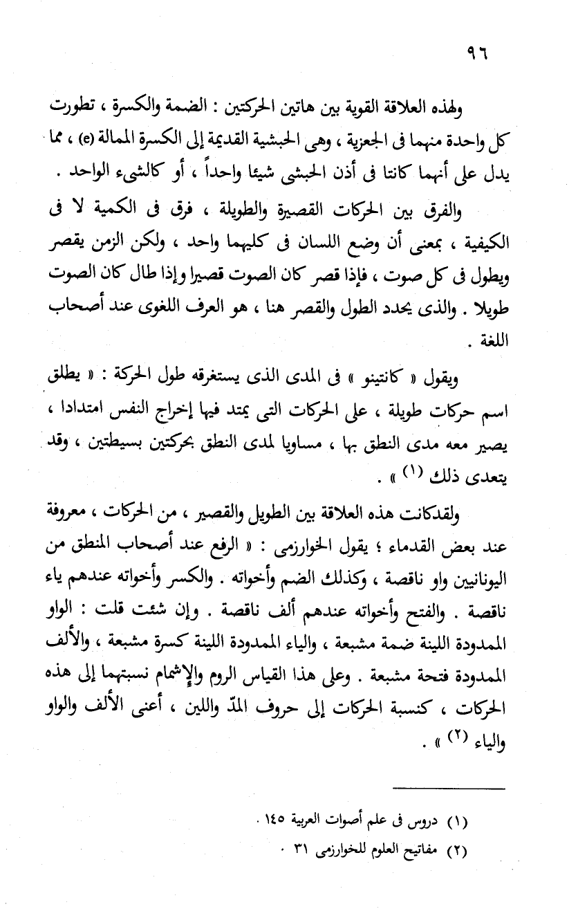 ولقد كانت هذه العلاقة بين الطويل والقصير، من الحركات، معروفة عند بعض القدماء، يقول الخوارزمي: "الرفع عند أصحاب المنطق من اليونانيين واو ناقصة، وكذلك الضم وأخواته. والكسر وأخواته عندهم ياء ناقصة. والفتح وأخواته عندهم ألف ناقصة. وإن شئت قلت: الواو الممدودة اللينة ضمة مشبعة، والياء الممدودة اللينة كسرة مشبعة، والألف الممدودة فتحة مشبعة. وعلى هذا القياس الروم والإشمام نسبتهما إلى هذه الحركات، كنسبة الحركات إلى حروف المد واللين، أعني الألف والواو والياء"2.