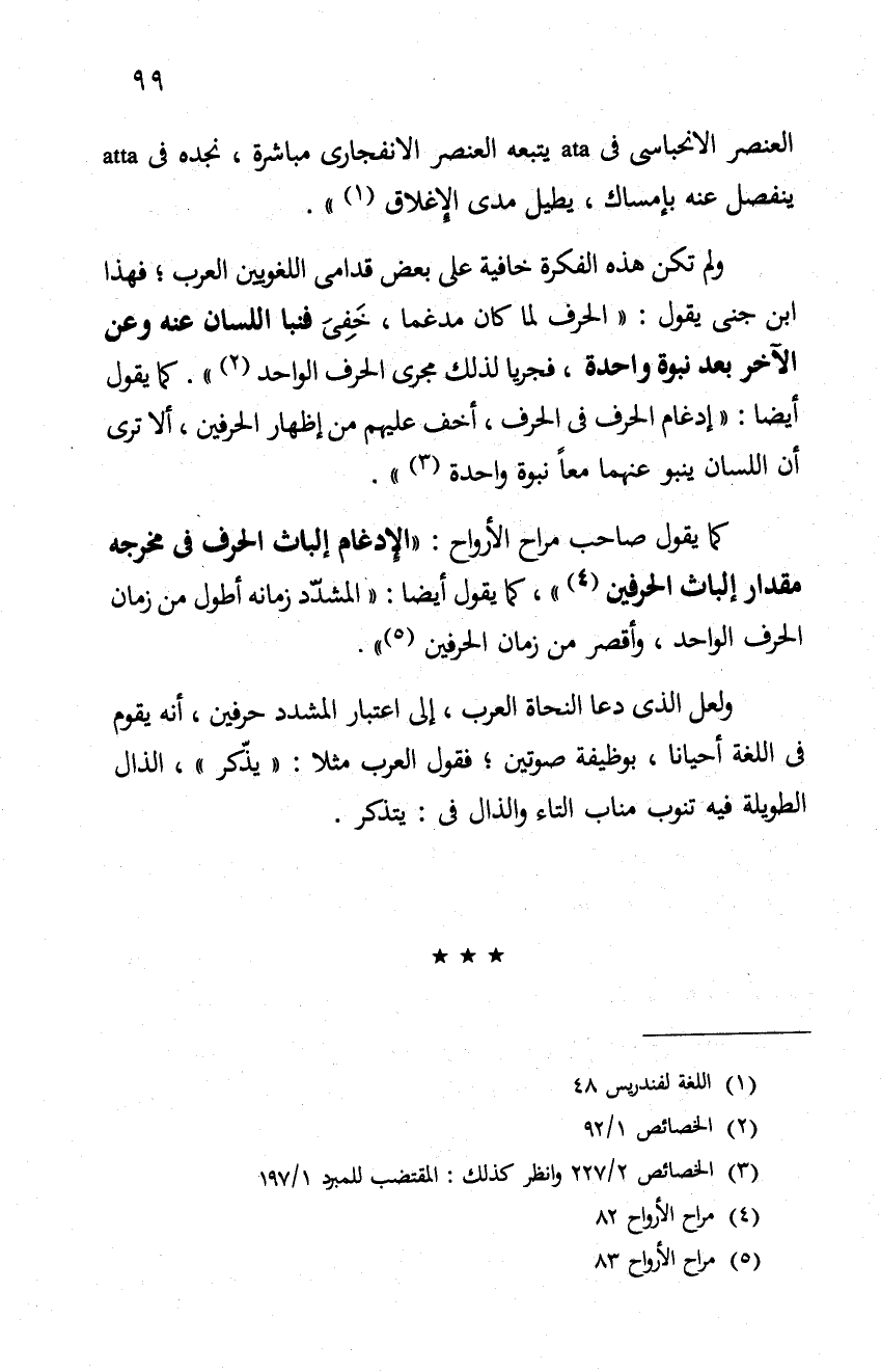ولم تكن هذه الفكرة خافية على بعض قدامى اللغويين العرب، فهذا ابن جني يقول: "الحرف لما كان مدغما، خفي فنبا السان عنه وعن الآخر بعد نبوة واحدة، فجريا لذلك مجرى الحرف الواحد"2. كما يقول أيضا: "إدغام الحرف في الحرف، أخف عليهم من إظهار الحرفين، ألا ترى أن اللسان ينبو عنهما معا نبوة واحدة"3.