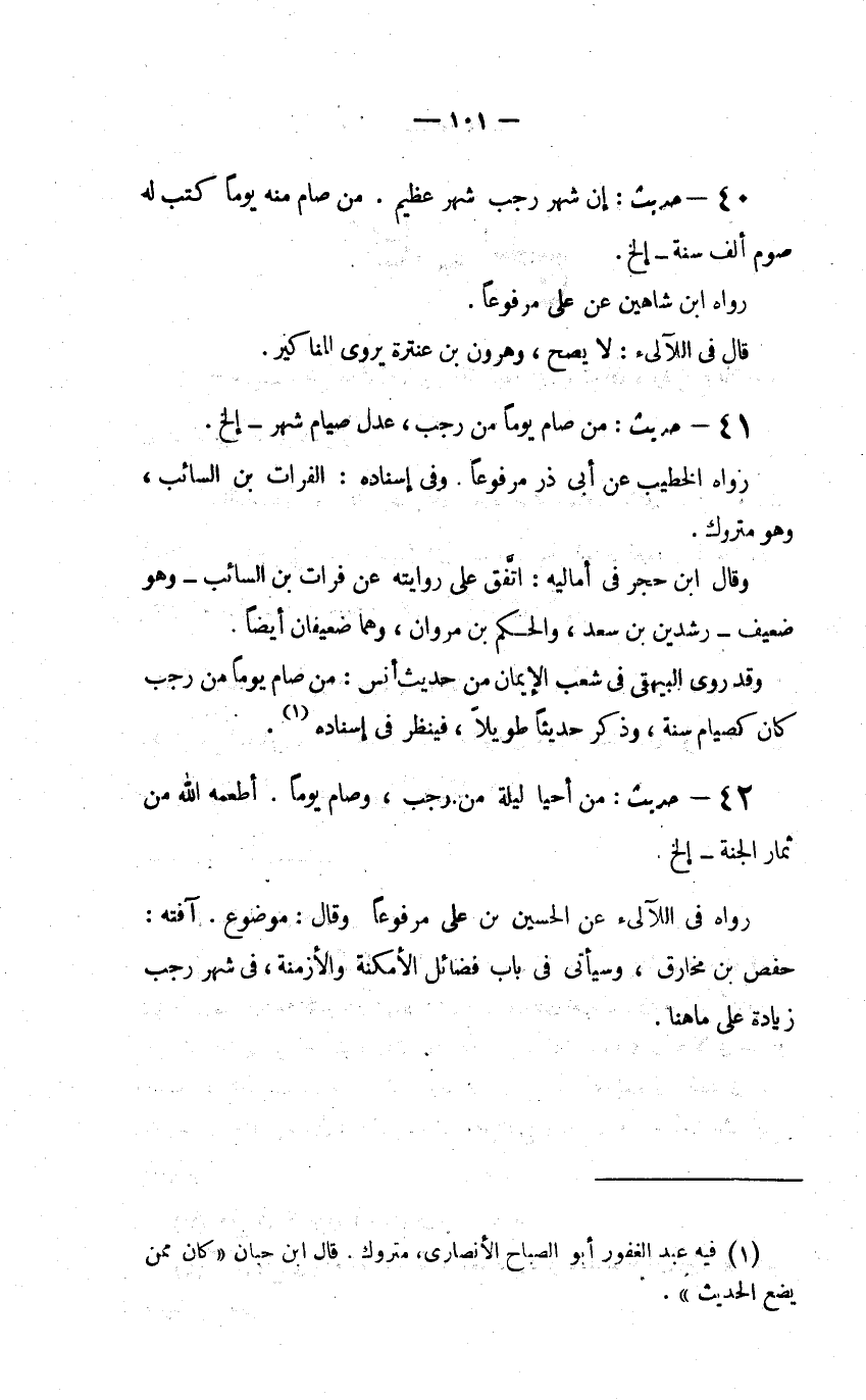 40 - حديث: "إِنَّ شَهْرَ رَجَبٍ شَهْرٌ عَظِيمٌ مَنْ صَامَ مِنْهُ يَوْمًا كُتِبَ لَهُ صَوْمُ أَلْفِ سَنَةٍ _ إلخ".