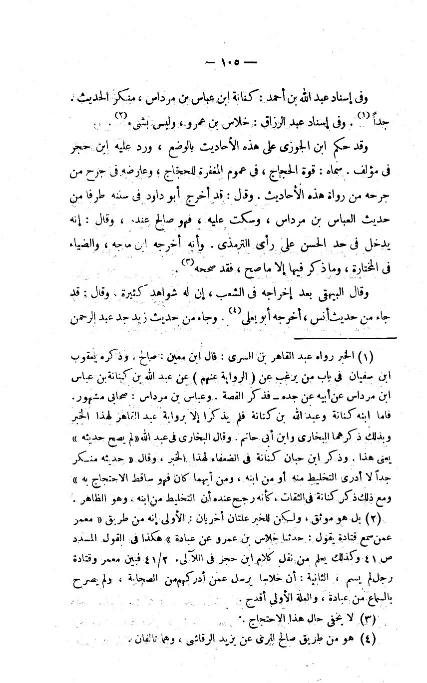 وفي إسناد عبد الله بن أحمد: كنانة ابن عَبَّاسِ بْنِ مِرْدَاسٍ مُنْكَرُ الْحَدِيثِ جداً (1) وفي إسناد عبد الرزاق: خِلاسُ بْنُ عَمْرٍو وَلَيْسَ بِشَيْءٍ (2) .