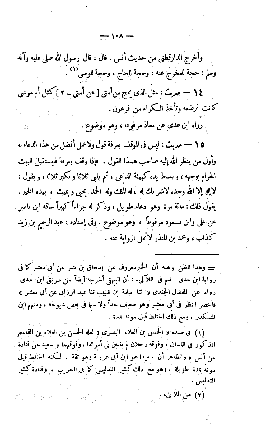 15 - حديث: "ليس في الْمَوْقِفِ بِعَرَفَةَ قَوْلٌ وَلا عَمَلٌ أَفْضَلَ مِنْ هَذَا الدُّعَاءِ وَأَوَّلُ من ينظر اللَّهُ إِلَيْهِ صَاحِبُ هَذَا الْقَوْلِ فَإِذَا وَقَفَ بِعَرَفَةَ فَلْيَسْتَقْبِلِ الْبَيْتَ الْحَرَامَ بِوَجْهِهِ وَيَبْسُطْ يَدَهُ كَهَيْئَةِ الدَّاعِي ثُمَّ يُلَبِّي ثَلاثًا وَيُكَبِّرُ ثَلاثًا وَيَقُولُ: لا إِلَهَ إِلا اللَّهُ وَحْدَهُ لا شَرِيكَ لَهُ لَهُ الْمُلْكُ وَلَهُ الْحَمْدُ يُحْيِي وَيُمِيتُ بِيَدِهِ الْخَيْرُ يَقُولُ ذَلِكَ: مِائَةَ مَرَّةٍ وَهُوَ دُعَاءٌ طَوِيلٌ وذكر له جزاءاً كبيرا ساقه ابْنُ نَاصِرٍ عَنْ عَلِيٍّ وَابْنِ مَسْعُودٍ مَرْفُوعًا وَهُوَ مَوْضُوعٌ وَفِي إِسْنَادِهِ: عَبْدُ الرَّحِيمِ بْنُ زَيْدٍ كَذَّابٌ وَمُحَمَّدُ بْنُ الْمُنْذِرِ لا تحل الرواية عنه.