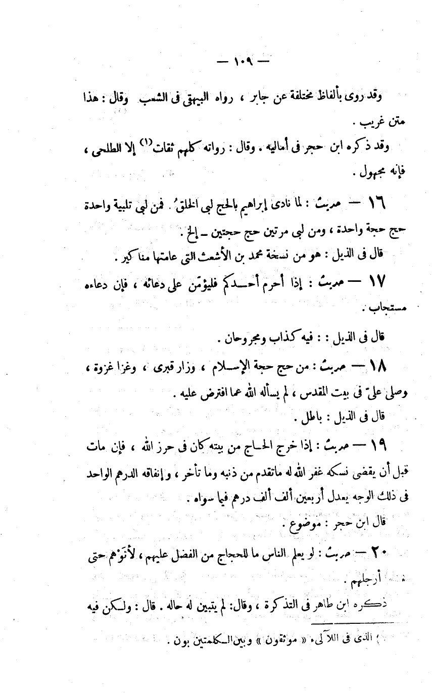 16 - حديث: "لَمَّا نَادَى إِبْرَاهِيمُ بِالْحَجِّ لَبَّى الْخَلْقُ فَمَنْ لَبَّى تَلْبِيَةً وَاحِدَةً حَجَّ حَجَّةً وَاحِدَةً وَمَنْ لَبَّى مرتين حج حجتين _ إلخ.
