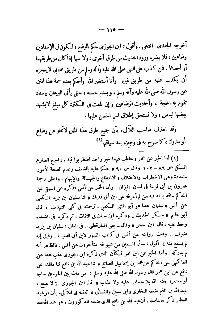 وقد اعترف صاحب اللآلىء بِأَنَّ جَمِيعَ طُرُقِ هَذَا الْمَتْنِ لا تَخْلُو عَنْ وَضَّاعٍ أَوْ مَتْرُوكٍ، كَمَا صَرَّحَ بِهِ فِي وجيزه بعد سياقها (1)