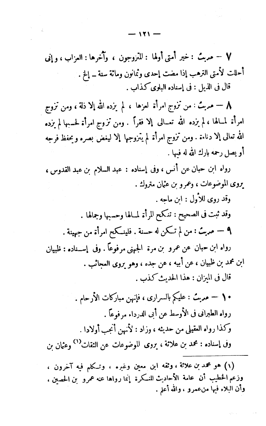 7 - حديث: "خَيْرُ أُمَّتِي أَوَّلُهَا: الْمُتَزَوِّجُونَ وَآخِرُهَا: الْعُزَّابُ وَإِنِّي أَحْلَلْتُ لأُمَّتِي التَّرَهُّبَ إِذَا مَضَتْ إِحْدَى وَثَمَانُونَ وَمِائَةُ سنة _ إلخ.