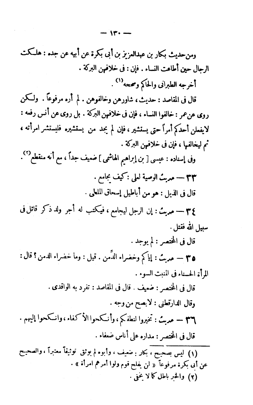 وَمِنْ حَدِيثِ بَكَّارِ بْنِ عَبْدِ الْعَزِيزِ بْنِ أَبِي بَكْرَةَ عَنْ أَبِيهِ عَنْ جَدِّهِ: هَلَكَتِ الرِّجَالُ حِينَ أَطَاعَتِ النِّسَاءُ. فَإِنَّ: فِي خِلافِهِنَّ الْبَرَكَةَ.