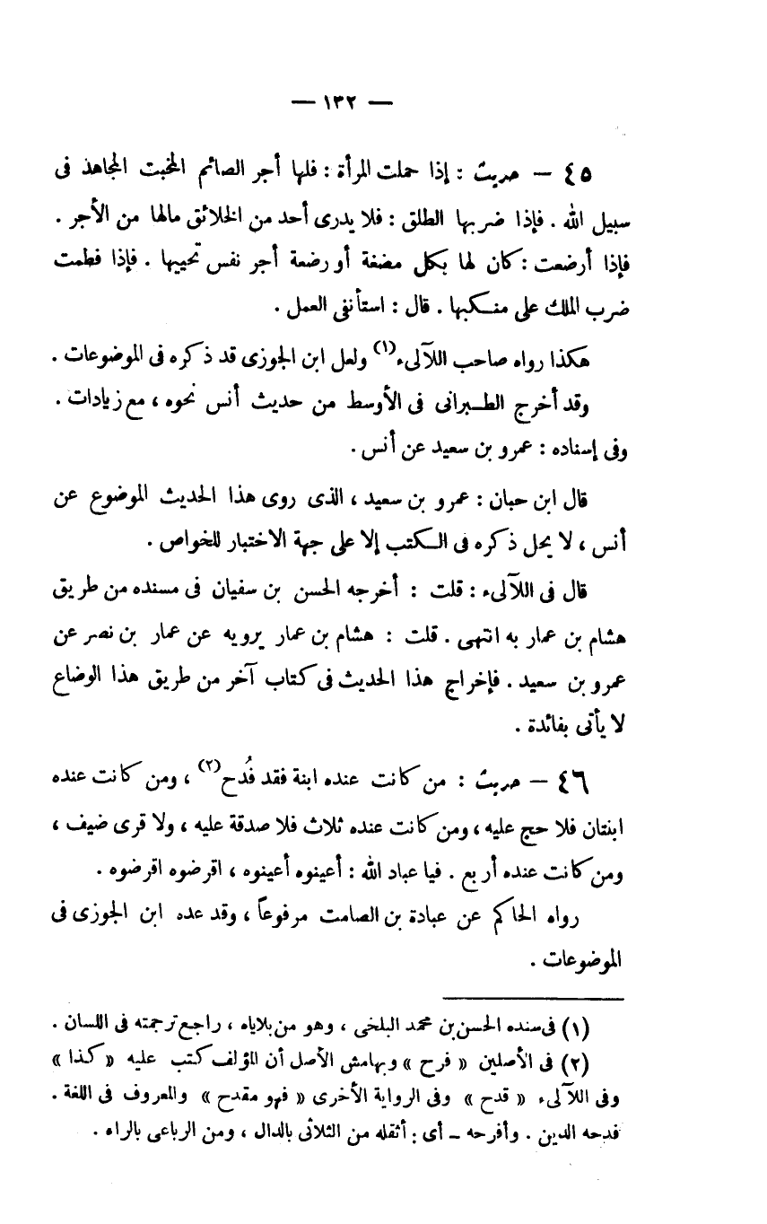 45 - حديث: "إِذَا حَمَلَتِ الْمَرْأَةُ: فَلَهَا أَجْرُ الصَّائِمِ الْمُخْبِتِ الْمُجَاهِدِ فِي سَبِيلِ اللَّهِ فَإِذَا ضَرَبَهَا الطَّلْقُ: فَلا يَدْرِي أَحَدٌ مِنَ الْخَلائِقِ مَا لَهَا مِنَ الأَجْرِ فَإِذَا أَرْضَعَتْ: كَانَ لَهَا بِكُلِّ مُضْغَةٍ أَوْ رَضْعَةٍ أَجْرُ نَفْسٍ تُحْيِيهَا فَإِذَا فَطَمَتْ ضَرَبَ الْمَلَكُ عَلَى مَنْكِبِهَا قَالَ: اسْتَأْنِفِي الْعَمَلَ.