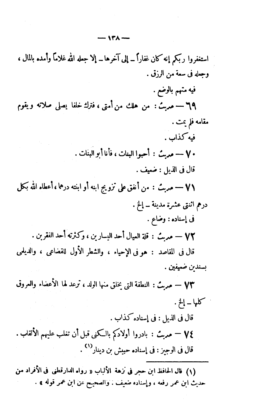 (1) قال الحافظ ابن حجر في نزهة الألباب (رواه الدارقطني في الأفراد من حديث بن عمر رفعه، واسناده ضعيف. والصحيح عن ابن عمر قوله) .
