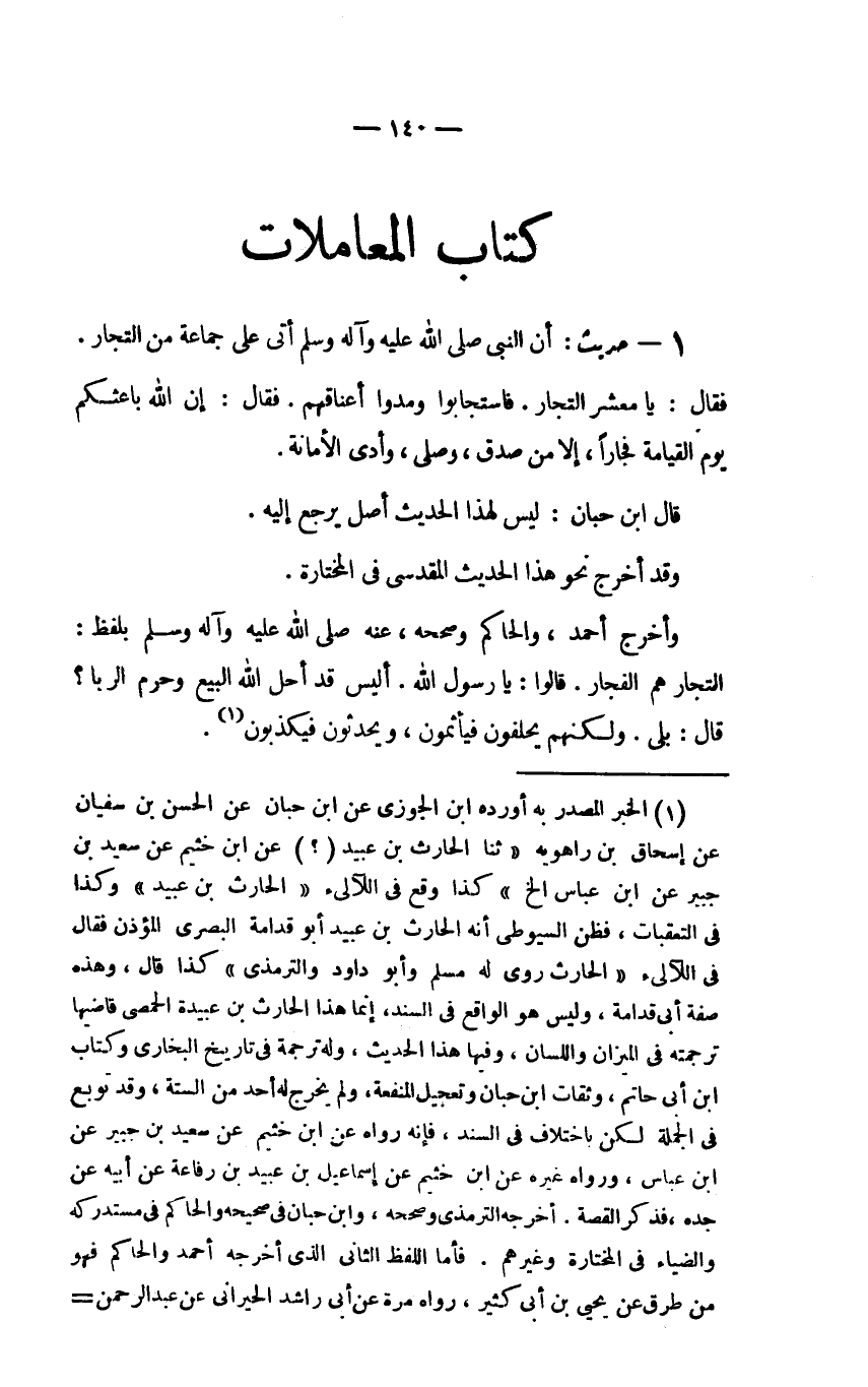 1 - حديث: "أَنَّ النَّبِيَّ صَلَّى اللَّهُ عَلَيْهِ وَسَلَّمَ أَتَى عَلَى جَمَاعَةٍ مِنَ التُّجَّارِ. فَقَالَ " يَا مَعْشَرَ التُّجَّارِ فَاسْتَجَابُوا وَمَدُّوا أَعْنَاقَهُمْ فَقَالَ: إِنَّ اللَّهَ بَاعِثُكُمْ يَوْمَ الْقِيَامَةِ فُجَّارًا إِلا مَنْ صَدَّقَ وَصَلَّى وَأَدَّى الأَمَانَةَ".