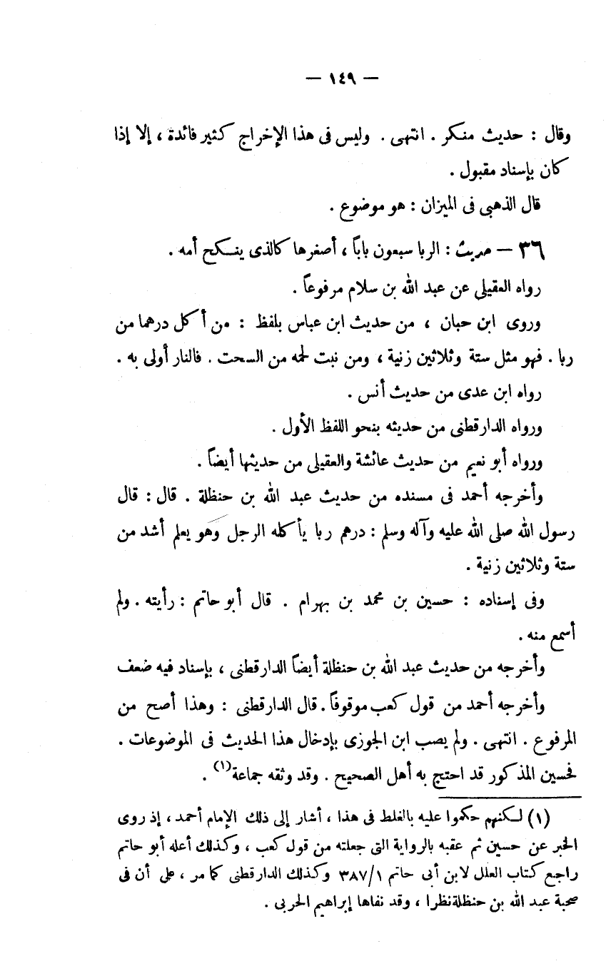 وَأَخْرَجَهُ أَحْمَدُ فِي مُسْنَدِهِ مِنْ حَدِيثِ عَبْدِ اللَّهِ بْنِ حَنْظَلَةَ. قَالَ: قَالَ رَسُولُ اللَّهِ صَلَّى اللَّهُ عَلَيْهِ وَآلِهِ وَسَلَّمَ: دِرْهَمُ رِبًا يَأْكُلُهُ الرَّجُلُ وَهُوَ يَعْلَمُ أَشَدُّ مِنْ سِتَّةٍ وَثَلاثِينَ زَنْيَةً.