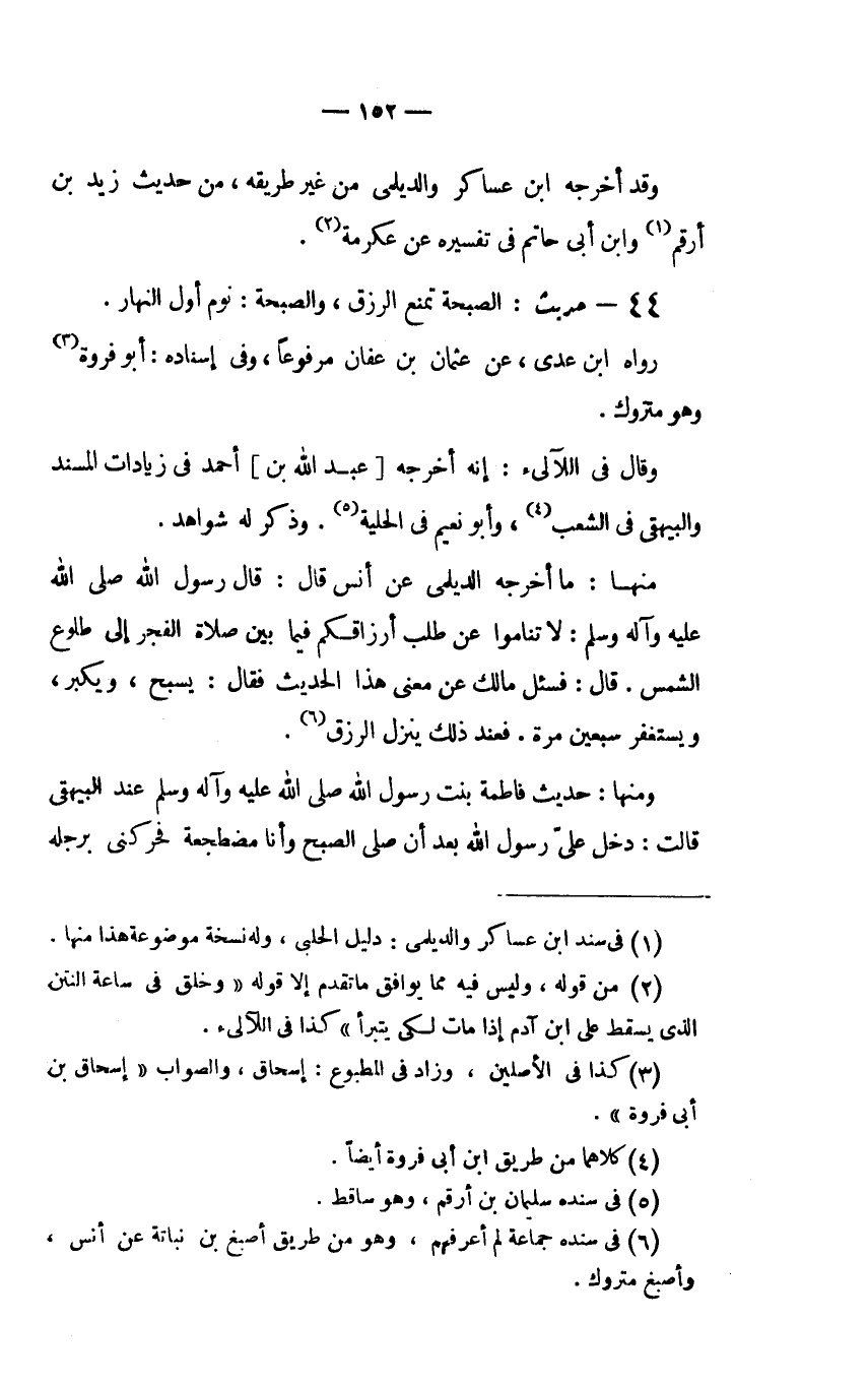 مِنْهَا: مَا أَخْرَجَهُ الدَّيْلَمِيُّ عَنْ أَنَسٍ قَالَ: قَالَ رَسُولُ اللَّهِ صَلَّى الله عليه وَسَلَّمَ لا تَنَامُوا عَنْ طَلَبِ أَرْزَاقِكُمْ فِيمَا بَيْنَ صَلاةِ الْفَجْرِ إلى طُلُوعِ الشَّمْسِ قَالَ: فَسُئِلَ مَالِكٌ عَنْ مَعْنَى هَذَا الْحَدِيثِ فَقَالَ: يُسَبِّحُ وَيُكَبِّرُ وَيَسْتَغْفِرُ سَبْعِينَ مَرَّةً فَعِنْدَ ذَلِكَ يَنْزِلُ الرِّزْقَ (6) .