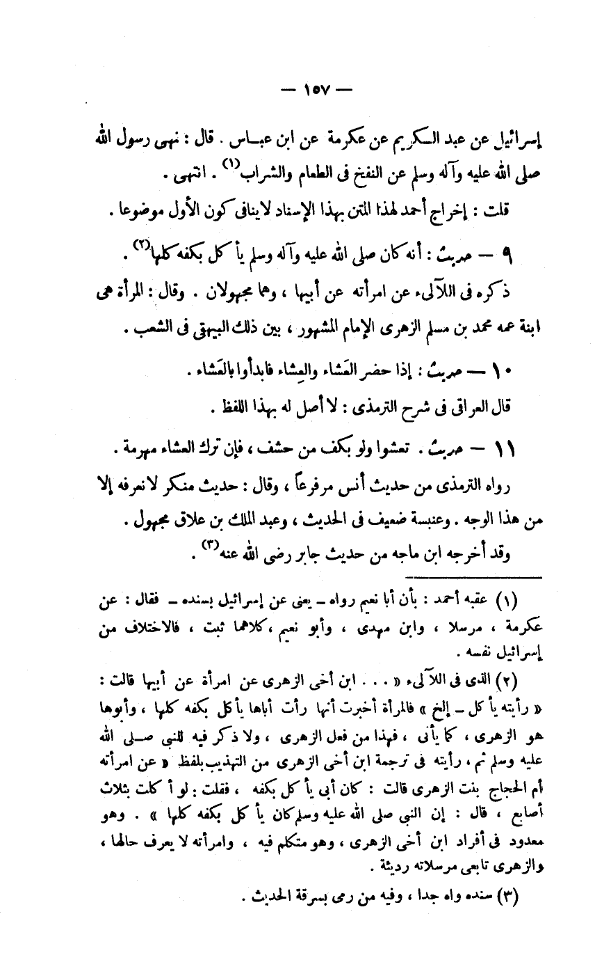 (2) الذي في اللآلىء (..... ابن أخي الزهري عن امرأة عن أبيها قالت: (رأيته يأكل إلخ) فالمرأة أخبرت أنها رأت أباها يأكل بكفه كلها، وأبوها هو الزهري، كما يأتي، فهذا من فعل الزهري، ولا ذكر فيه للنبي صلى الله عليه وسلم ثم، رأيته في ترجمة ابن أخي الزهري من التهذيب بلفظ (عن امرأته أم الحجاج بنت الزهري قالت: كان أبي يأكل بكفه، فقلت: لو أكلت بثلاث أصابع، قال، أَنَّ النَّبِيَّ صَلَّى اللَّهُ عَلَيْهِ وسلم كان يأكل بكفه كلها) . وهو معدود في أفراد ابن أخي الزهري، وهو متكلم فيه، وامرأته لا يعرف حالها، والزهري تابعي مرسلاته رديئة.