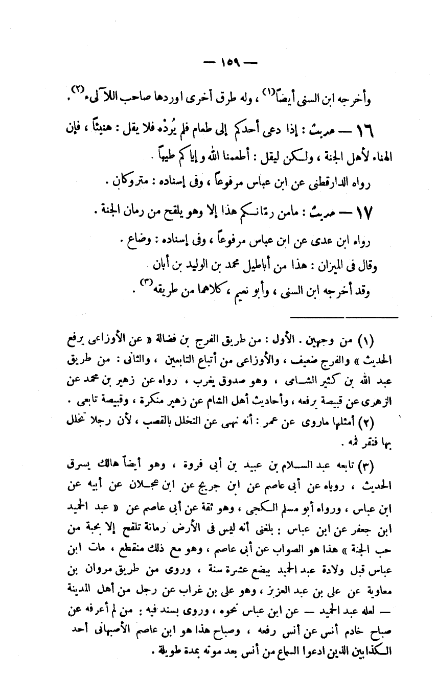 (3) تابعه عبد السلام بن عبيد بن أبي فروة، وهو أيضاً هالك يسرق الحديث، روياه عن أبي عاصم عن ابن جريج عن ابن عجلان عن أبيه عن ابن عباس، ورواه أبو مسلم الكجي، وهو ثقة عن أبي عاصم عن (عبد الحميد بن جعفر عن ابن عباس: بلغني أنه ليس في الأرض رمانة تلقح إلا بحبة من حب الجنة) هذا هو الصواب عن أبي عاصم، وهو مع ذلك منقطع، مات ابن عباس قبل ولادة عبد الحميد ببضع عشرة سنة، وروى من طريق مروان بن معاوية عن علي بن عبد العزيز، وهو على بن غراب عن رجل من أهل المدينة لعله عبد الحميد عن ابن عباس نحوه، وروى بسند فيه: من لم أعرفه عن صباح خادم أنس عن أنس رفعه، وصباح هذا هو ابن عاصم الأصبهاني أحد الكذابين اللذين ادعوا السماع من أنس بعد موته بمدة طويلة