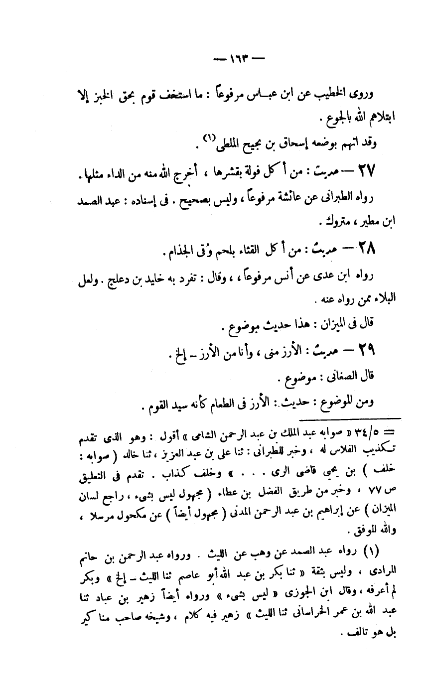 (1) رواه عبد الصمد عن وهب عن ليث. ورواه عبد الرحمن بن حاتم المرادي، وليس بثقة (ثنا بكر بن عبد الله أبو عاصم ثنا الليث إلخ) وبكر لم أعرفه، وقال ابن الجوزي (ليس بشيء) ورواه أيضاً زهير بن عباد ثنا عبد الله بن عمر الخرساني ثنا الليث زهير فيه كلام، وشيخه صاحب منا كير بل هو تالف