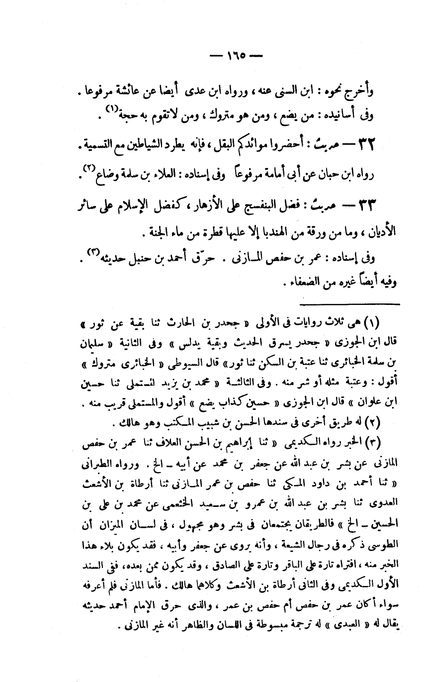 (3) الخبر رواه الكديمي (ثنا إبراهيم بن الحسن العلاف ثنا عمر بن حفصا المازني عن بشر بن عبد الله عن جعفر بن محمد عن أبيه إلخ. ورواه الطبراني (ثنا أحمد بن داود المكي ثنا حفص بن عمر المازني ثنا أرطاة بن الأشعث العدوي ثنا بشر بن عبد الله بن عمرو بن سعيد الخثعمي عن محمد بن علي بن الحسين إلخ) فالطريقان يجتمعان في بشر وهو مجهول، في لسان الميزان أن الطوسي ذكره في رجال الشيعة، وأنه يروي عن جعفر وأبيه، فقد يكون بلاء هذا الخبر منه، افتراه تارة عن الباقر وتارة عن الصادق، وقد يكون ممن بعده، ففي السند الأول الكديمي وفي الثاني أرطاة بن الأشعث وكلاهما هالك. فأما المازني فلم أعرفه سواء أكان عمر بن حفص أم حفص بن عمر، والذي حرق الإمام أحمد حديثه يقال له (العبدي) له ترجمة مبسوطة في اللسان والظاهر أنه غير المازني