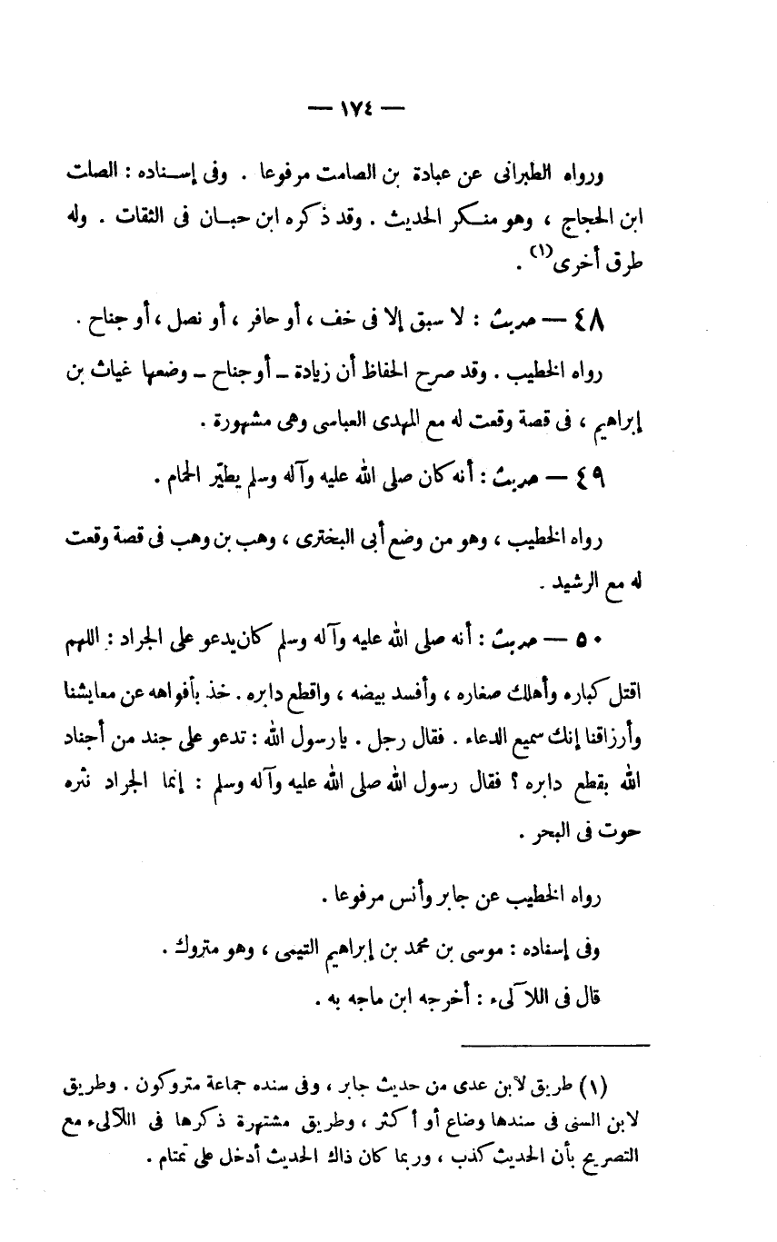 48 - حديث: "لا سَبَقَ إِلا فِي خُفٍّ أَوْ حَافِرٍ أَوْ نَصْلٍ أَوْ جَنَاحٍ رَوَاهُ الْخَطِيبُ. وَقَدْ صَرَّحَ الْحُفَّاظُ أَنَّ زِيَادَةَ _ أَوْ جَنَاحٍ _ وَضَعَهَا غِيَاثُ بْنُ إِبْرَاهِيمَ فِي قِصَّةٍ وَقَعَتْ لَهُ مَعَ الْمَهْدِيُّ العباسي وهي