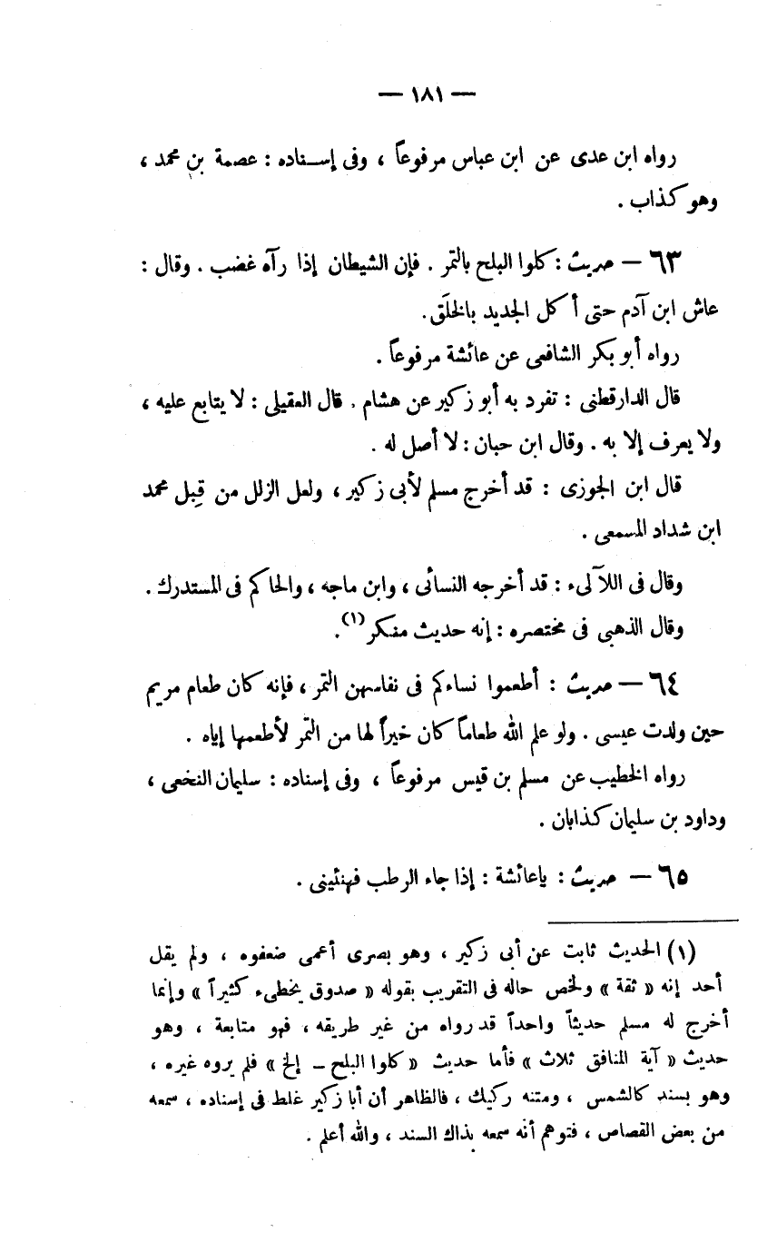 رَوَاهُ الْخَطِيبُ عَنْ مُسْلِمِ بْنِ قَيْسٍ مَرْفُوعًا وَفِي إِسْنَادِهِ: سُلَيْمَانُ النَّخَعِيُّ وَدَاوُدُ بن سليمان كذابان. 65 - حديث: "يَا عَائِشَةُ إِذَا جَاءَ الرُّطَبُ فهنئيني".