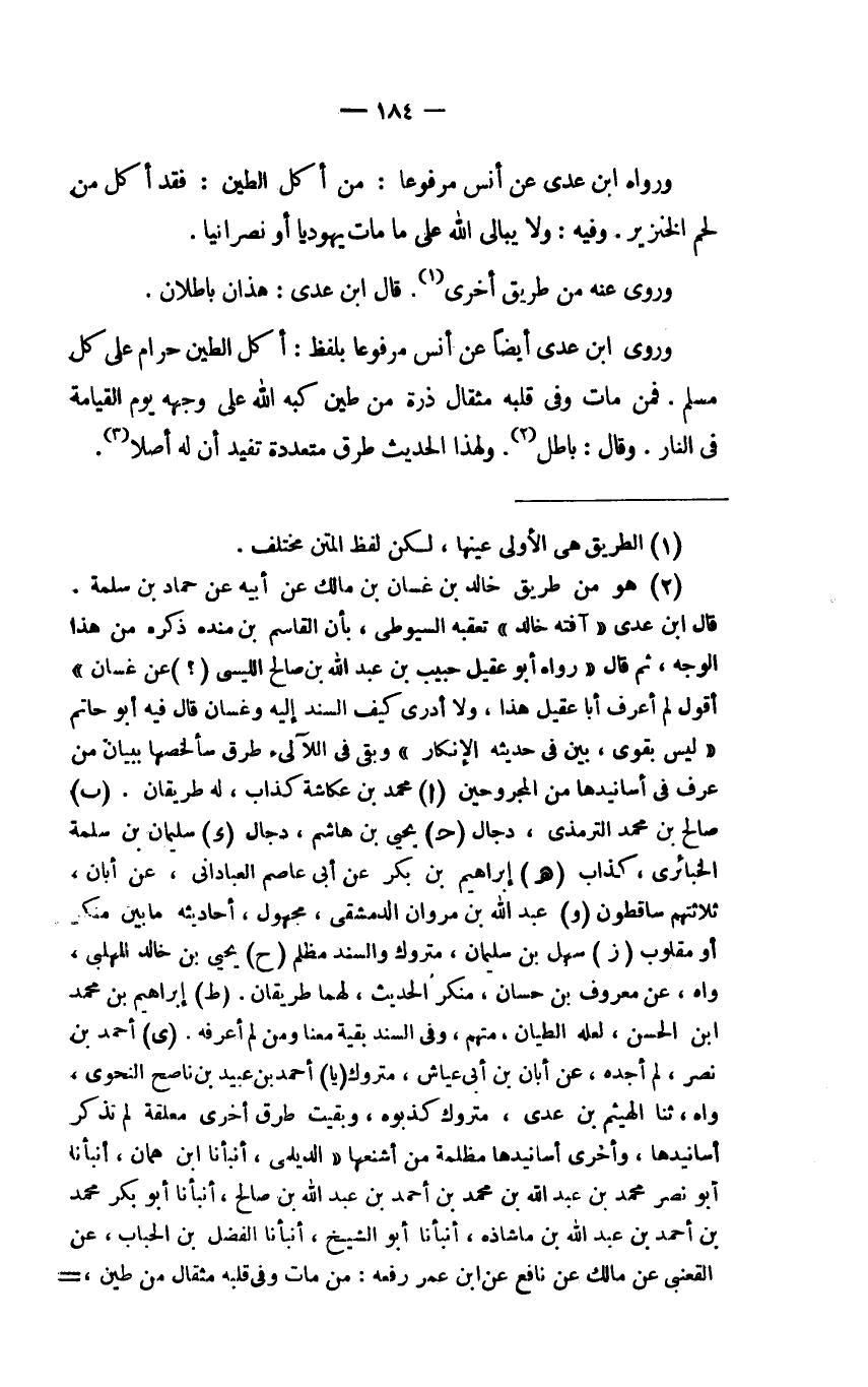 وَرَوَى ابْنُ عَدِيٍّ أَيْضًا عَنْ أَنَسٍ مَرْفُوعًا بِلَفْظِ: أَكْلُ الطِّينِ حَرَامٌ عَلَى كُلِّ مُسْلِمٍ فَمَنْ مَاتَ وَفِي قَلْبِهِ مِثْقَالُ ذَرَّةٍ مِنْ طِينٍ كَبَّهُ اللَّهُ على وجهه يوم القيامة في النَّارِ وَقَالَ: بَاطِلٌٍ (2) وَلِهَذَا الْحَدِيثِ طُرُقٌ مُتَعَدِّدَةٌ تُفِيدُ أَنَّ لَهُ أصلا.